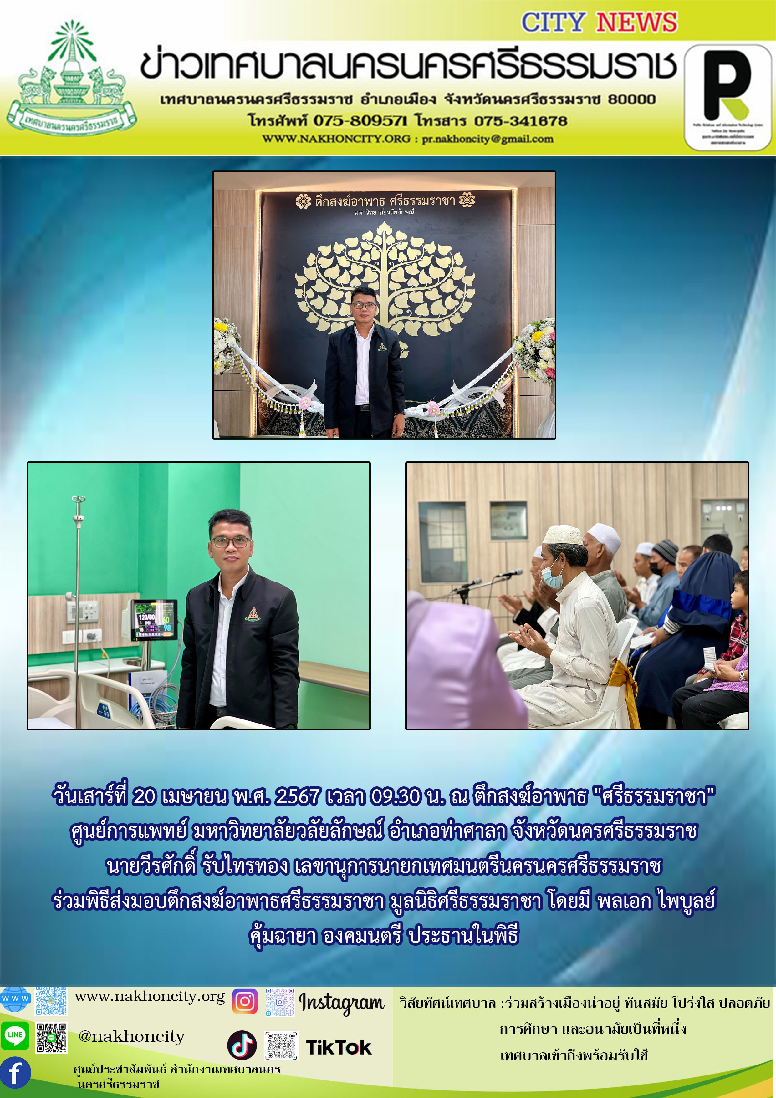 | วันเสาร์ที่ 20 เมษายน พ.ศ. 2567 เวลา 09.30 น. ณ ตึกสงฆ์อาพาธ "ศรีธรรมราชา" ศูนย์การแพทย์ มหาวิทยาลัยวลัยลักษณ์ อำเภอท่าศาลา จังหวัดนครศรีธรรมราช ภาพ//ข่าว//ไกรสิทธิ |