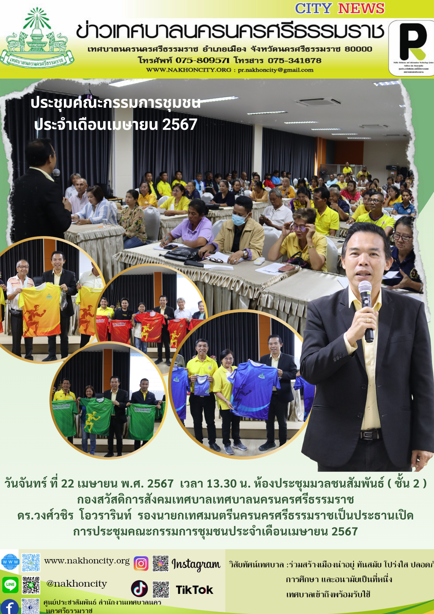 | ดร.วงศ์วชิร โอวรารินท์ รองนายกเทศมนตรีนครนครศรีธรรมราชเป็นประธานเปิด การประชุมคณะกรรมการชุมชนประจำเดือนเมษายน 2567 |
