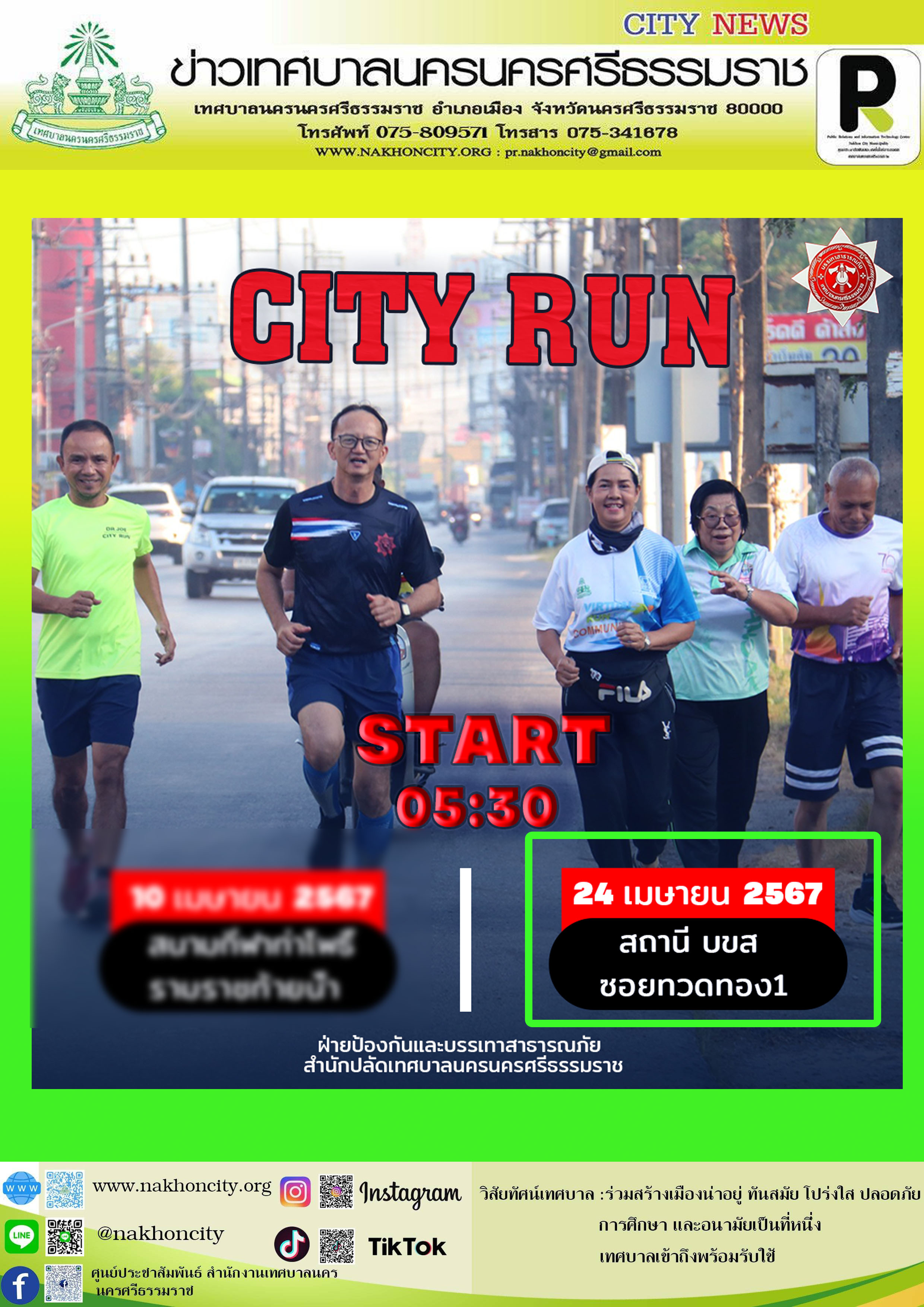 | เทศบาลนครนครศรีธรรมราช ขอเชิญประชาชนร่วมกิจกรรม วิ่ง “City Run วันพุธ” วันพุธที่ 24 เมษายน พ.ศ.2567 เวลา 05.30 น. ณ จุดนัดพบ สถานีขนส่งผู้โดยสาร (บขส.) |