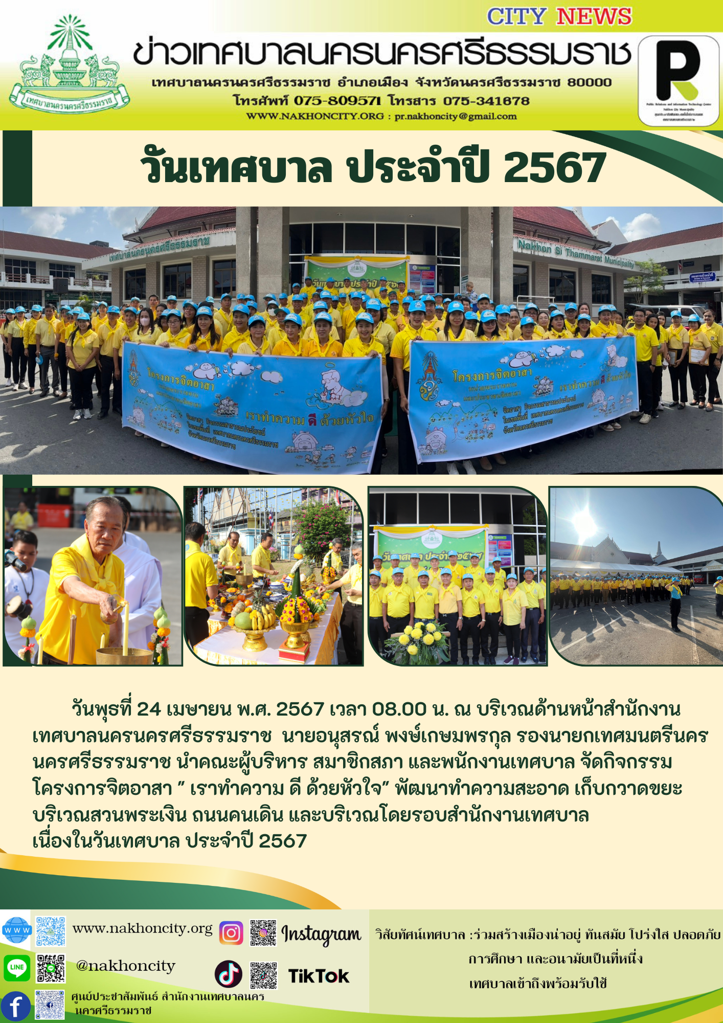 | วันพุธที่ 24 เมษายน พ.ศ. 2567 เวลา 08.00 น. ณ บริเวณด้านหน้าสำนักงานเทศบาลนครนครศรีธรรมราช นายอนุสรณ์ พงษ์เกษมพรกุล รองนายกเทศมนตรีนครนครศรีธรรมราช นำคณะผู้บริหาร สมาชิกสภา และพนักงานเทศบาล ร่วมกิจกรรมโครงการจิตอาสา " เราทำความ ดี ด้วยหัวใจ" พัฒนาทำความสะอาด เก็บกวาดขยะ บริเวณสวนพระเงิน ถนนคนเดิน และบริเวณโดยรอบสำนักงานเทศบาล เนื่องในวันเทศบาล ประจำปี 2567 |
