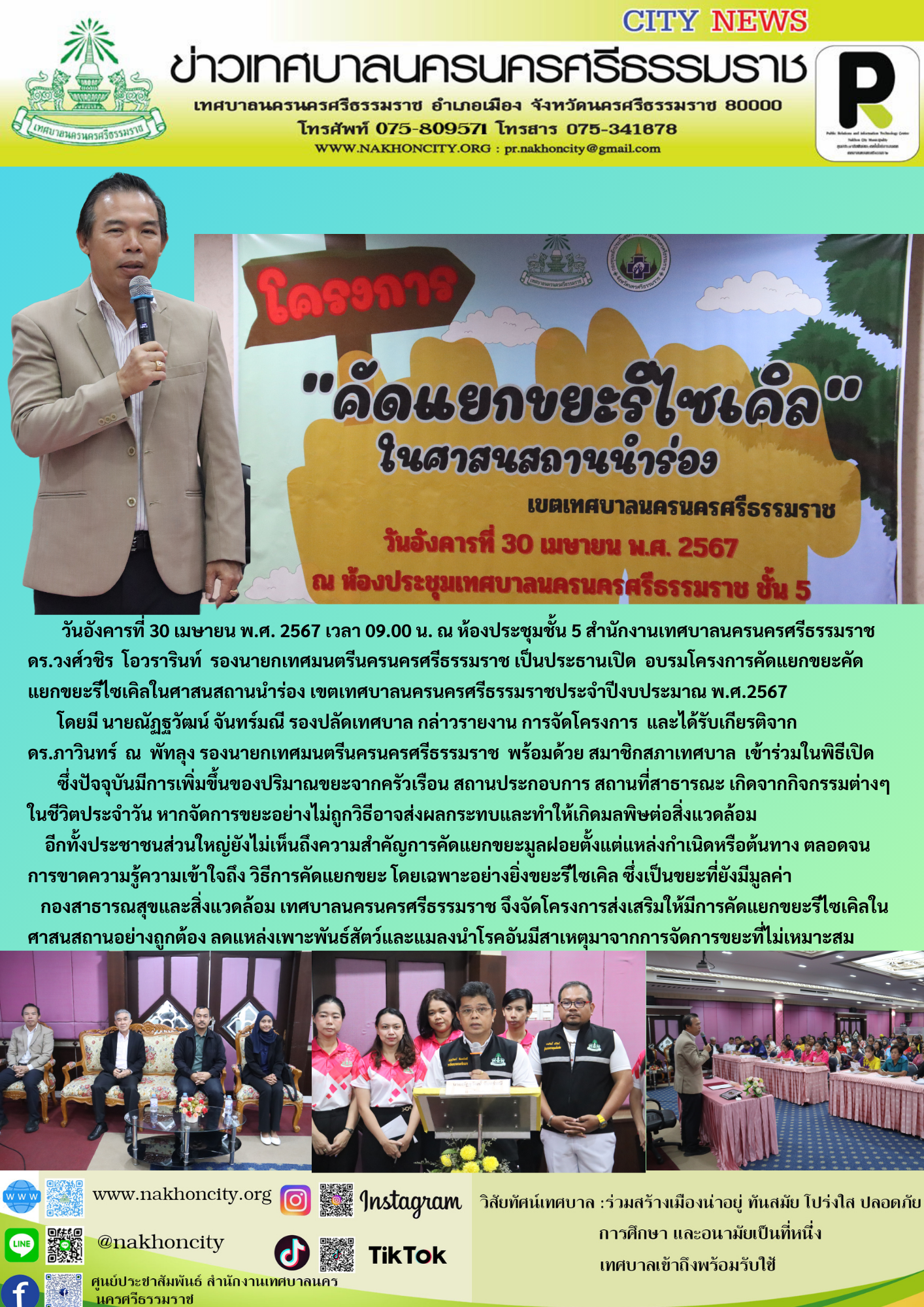 | ดร.วงศ์วชิร โอวรารินท์ รองนายกเทศมนตรีนครนครศรีธรรมราช เป็นประธานเปิด โครงการคัดแยกขยะคัดแยกขยะรีไซเคิลในศาสนสถานนำร่อง เขตเทศบาลนครนครศรีธรรมราชประจำปีงบประมาณ พ.ศ.2567 |