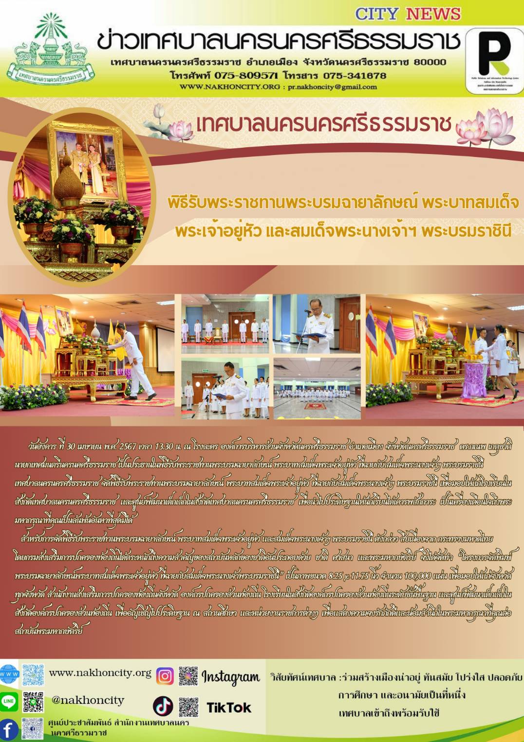 | เทศบาลนครนครศรีธรรมราช จัดพิธีรับพระราชทานพระบรมฉายาลักษณ์ พระบาทสมเด็จพระเจ้าอยู่หัว และสมเด็จพระนางเจ้าฯ พระบรมราชินี |