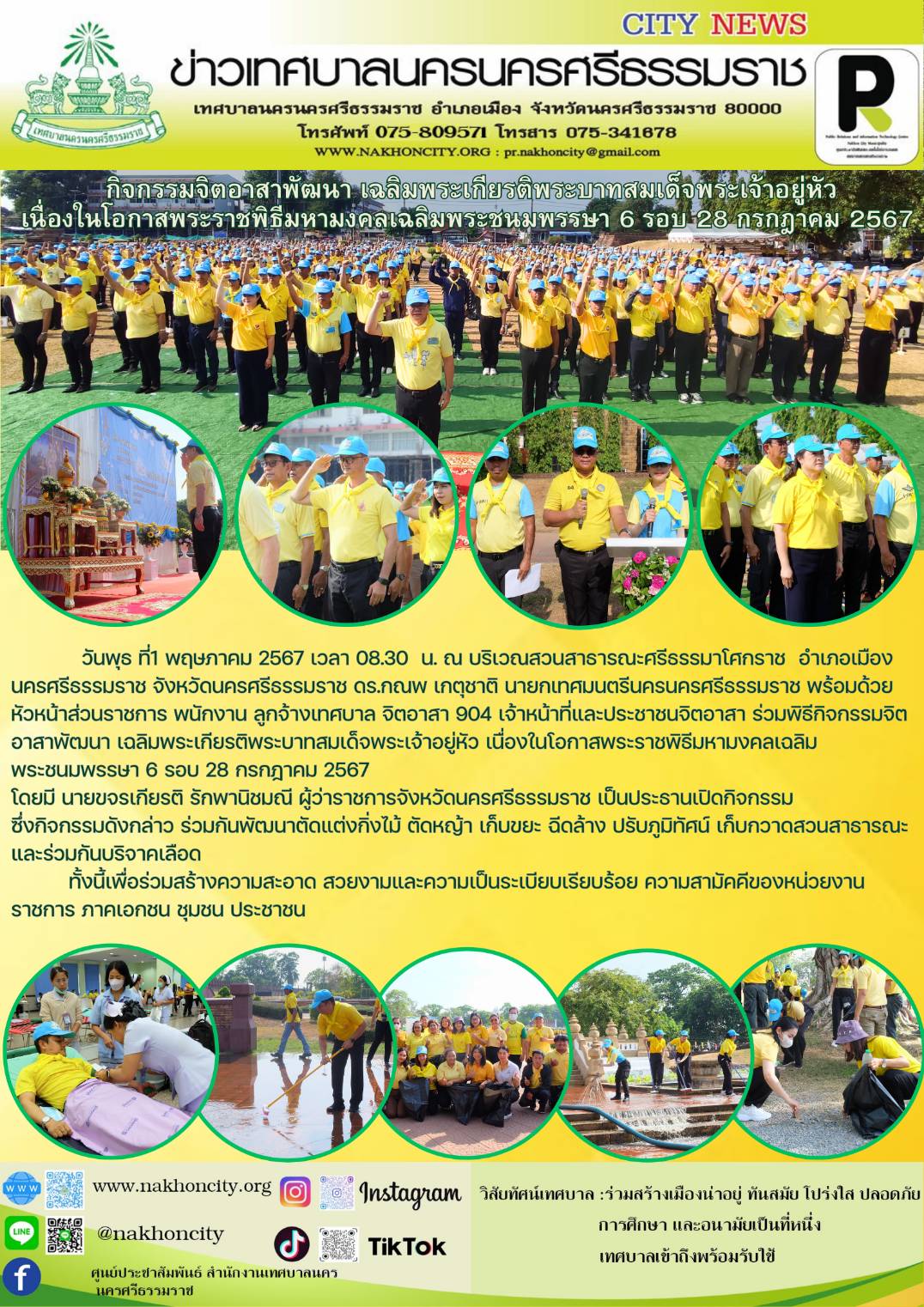 | ดร.กณพ เกตุชาติ นายกเทศมนตรีนครนครศรีธรรมราช ร่วมกิจกรรมจิตอาสาพัฒนา เฉลิมพระเกียรติพระบาทสมเด็จพระเจ้าอยู่หัว เนื่องในโอกาสพระราชพิธีมหามงคลเฉลิมพระชนมพรรษา 6 รอบ 28 กรกฎาคม 2567 |