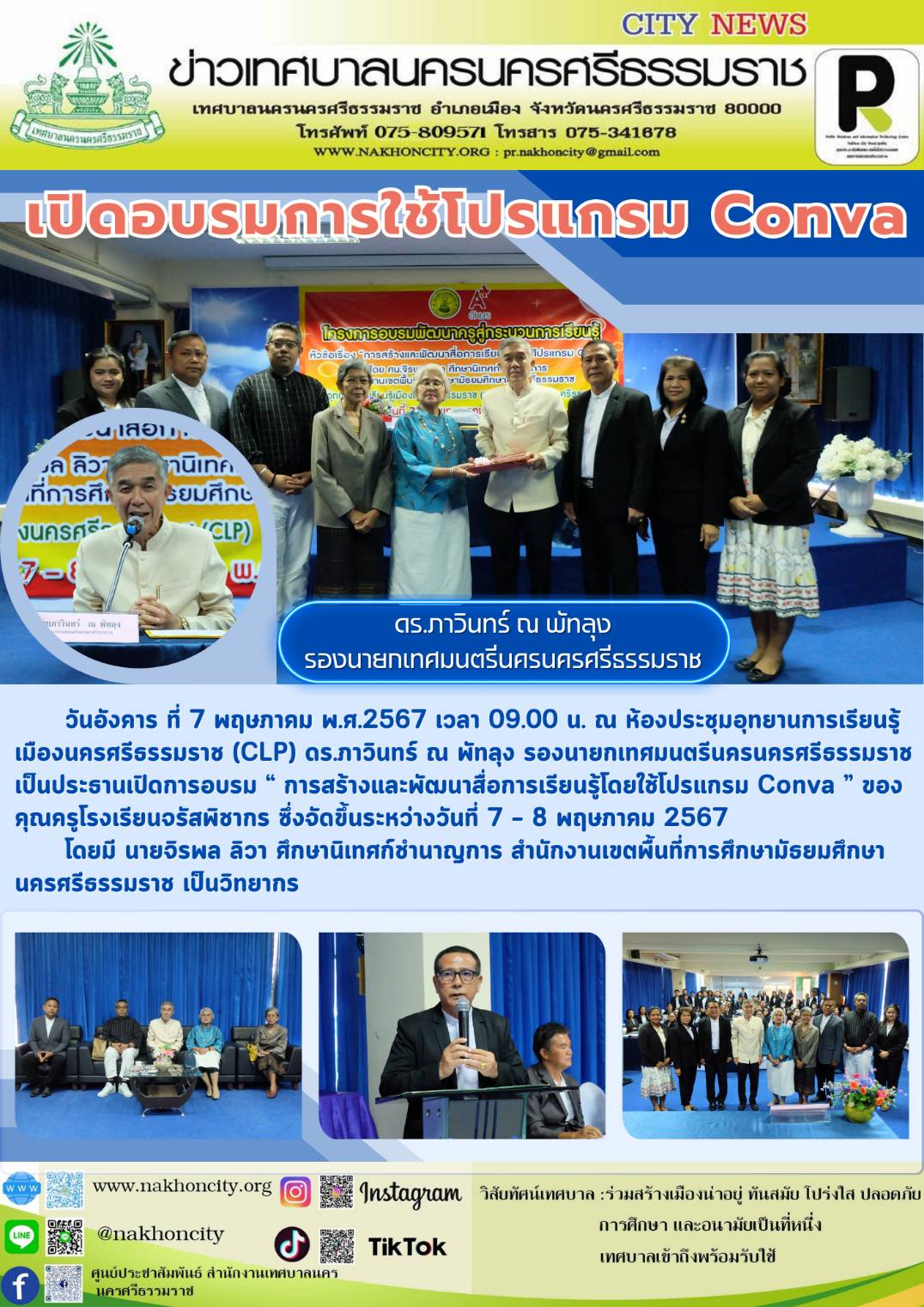 | ดร.ภาวินทร์ ณ พัทลุง รองนายกเทศมนตรีนครนครศรีธรรมราช เป็นประธานเปิดการอบรม “การสร้างและพัฒนาสื่อการเรียนรู้โดยใช้โปรแกรม Conva” |