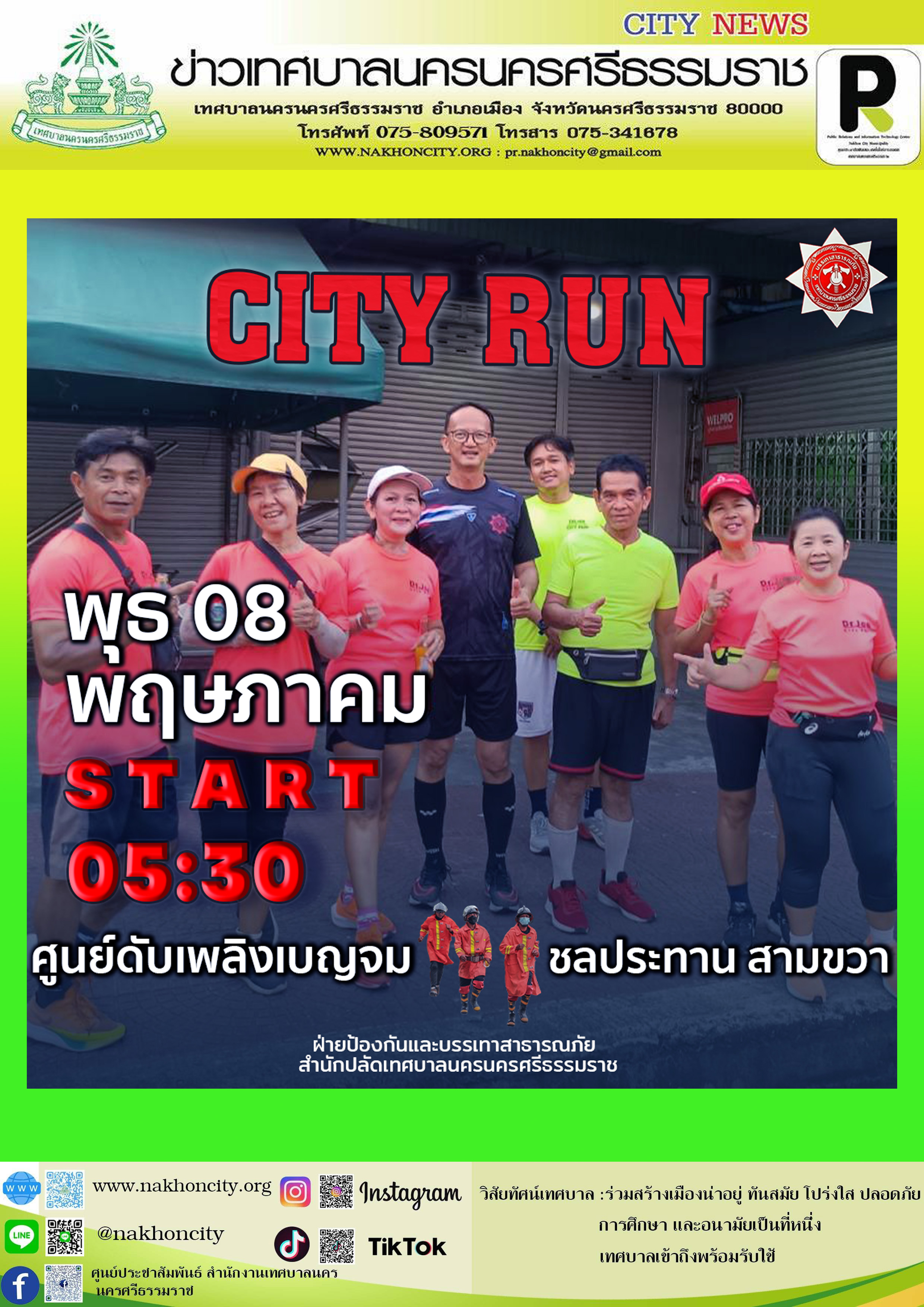 | “City Run วันพุธ” วันพุธที่ 8 พฤษภาคม พ.ศ.2567 เวลา 05.30 น. ณ จุดนัดพบ พร้อมที่ศูนย์ดับเพลิงเบญจม |