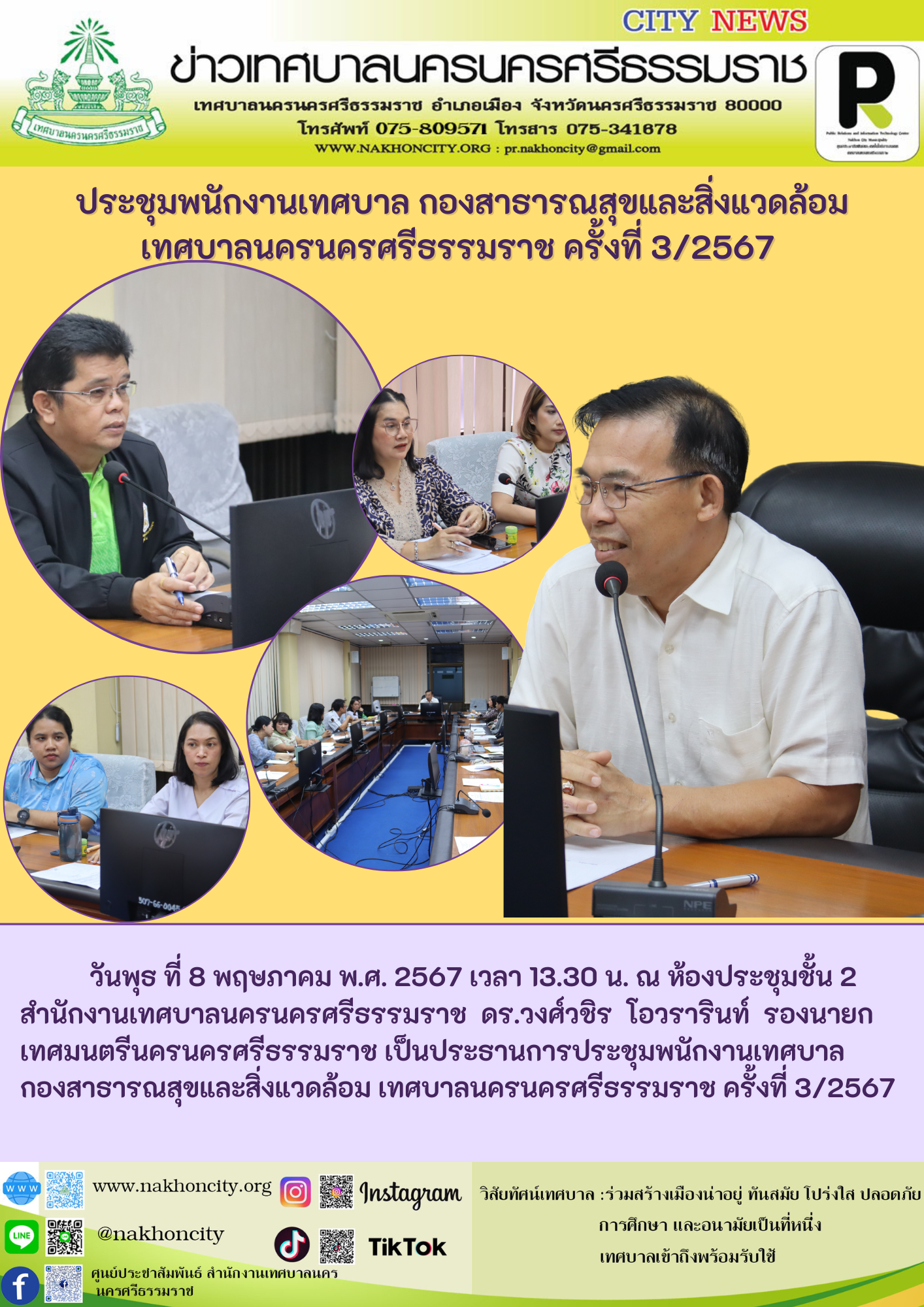 | ดร.วงศ์วชิร โอวรารินท์ รองนายกเทศมนตรีนครนครศรีธรรมราช เป็นประธานการประชุมพนักงานเทศบาล กองสาธารณสุขและสิ่งแวดล้อม เทศบาลนครนครศรีธรรมราช ครั้งที่ 3/2567 |