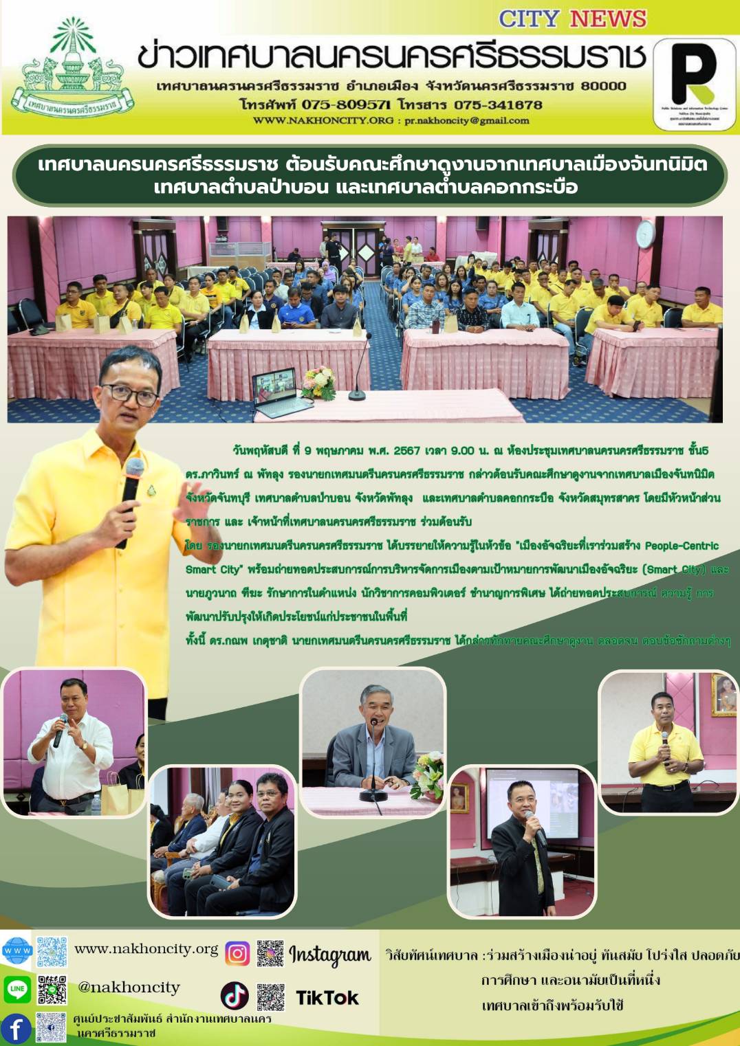 | วันพฤหัสบดี ที่ 9 พฤษภาคม พ.ศ. 2567 เวลา 9.00 น. ณ ห้องประชุมเทศบาลนครนครศรีธรรมราช ชั้น5 ดร.ภาวินทร์ ณ พัทลุง รองนายกเทศมนตรีนครนครศรีธรรมราช กล่าวต้อนรับคณะศึกษาดูงานจากเทศบาลเมืองจันทนิมิต จังหวัดจันทบุรี เทศบาลตำบลป่าบอน จังหวัดพัทลุง และเทศบาลตำบลคอกกระบือ จังหวัดสมุทรสาคร โดยมีหัวหน้าส่วนราชการ และ เจ้าหน้าที่เทศบาลนครนครศรีธรรมราช ร่วมต้อนรับ โดย รองนายกเทศมนตรีนครนครศรีธรรมราช ได้บรรยายให้ความรู้ในห้วข้อ "เมืองอัจฉริยะที่เราร่วมสร้าง People-Centric Smart City" พร้อมถ่ายทอดประสบการณ์การบริหารจัดการเมืองตามเป้าหมายการพัฒนาเมืองอัจฉริยะ (Smart City) และ นายภูวนาถ ฑีฆะ รักษาการในตำแหน่ง นักวิชาการคอมพิวเตอร์ ชำนาญการพิเศษ ได้ถ่ายทอดประสบการณ์ ความรู้ การพัฒนาปรับปรุงให้เกิดประโยชน์แก่ประชาชนในพื้นที่ ทั้งนี้ ดร.กณพ เกตุชาติ นายกเทศมนตรีนครนครศรีธรรมราช ได้กล่าวทักทายคณะศึกษาดูงาน ตลอดจน ตอบข้อซักถามต่างๆ ............ ภาพ//ข่าว//จันทร์จิรา ตรวจทาน//ฐิตินันท์ |