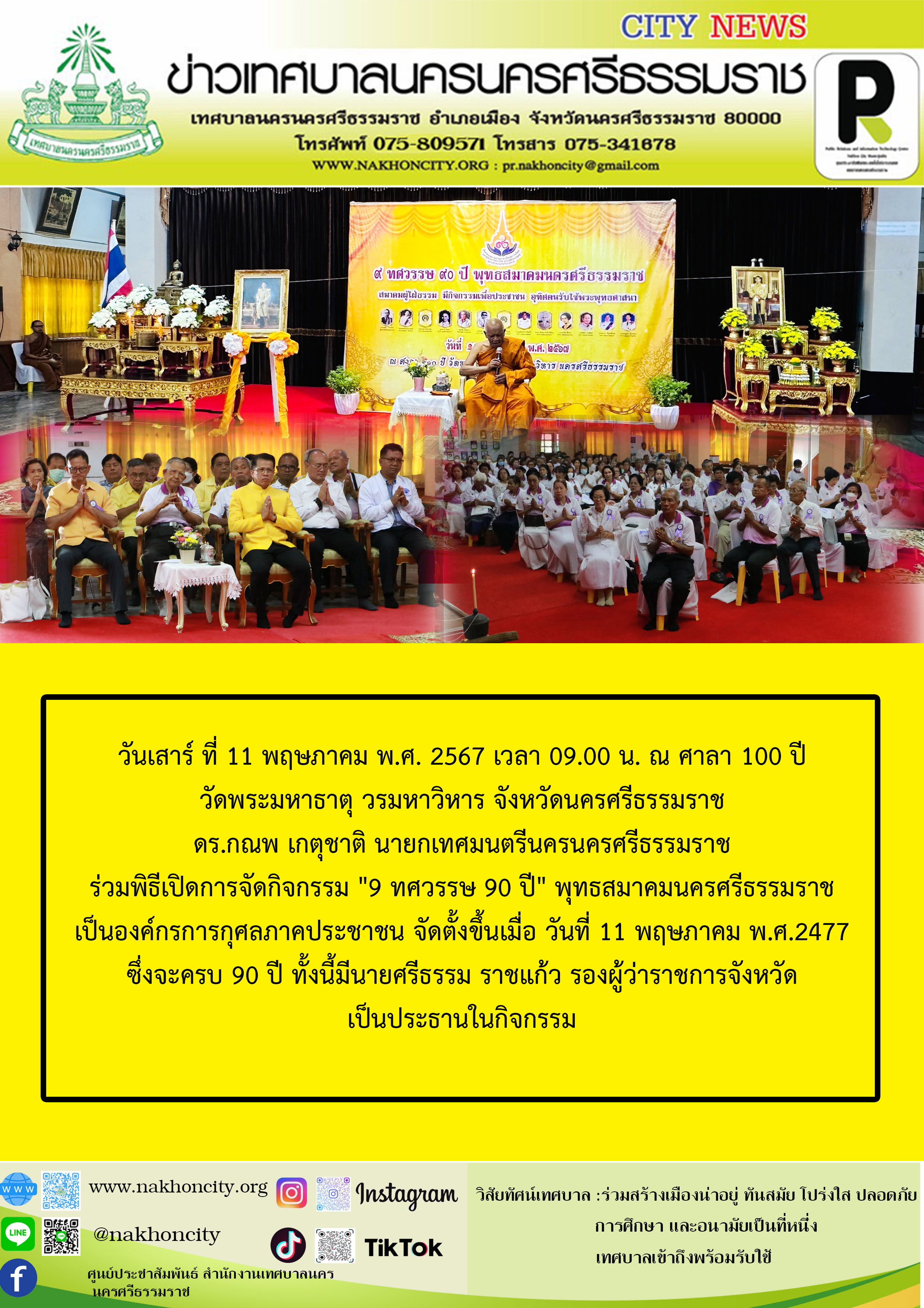 | ดร.กณพ เกตุชาติ นายกเทศมนตรีนครนครศรีธรรมราชร่วมพิธีเปิดการจัดกิจกรรม "9 ทศวรรษ 90 ปี" พุทธสมาคมนครศรีธรรมราช |
