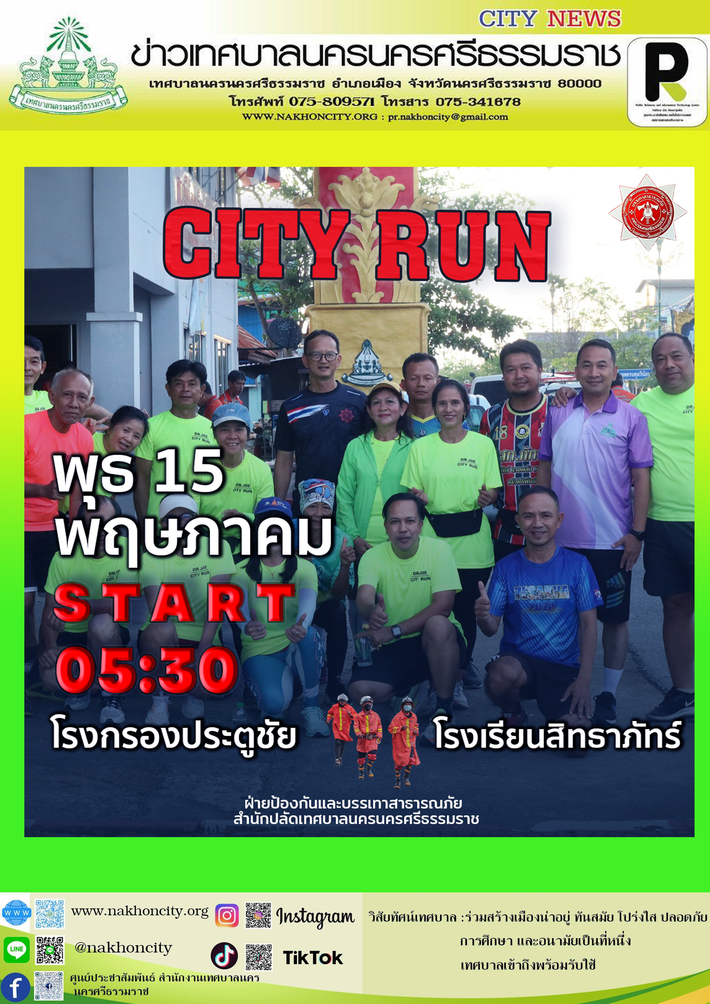 | เทศบาลนครนครศรีธรรมราช ขอเชิญประชาชนร่วมกิจกรรม วิ่ง “City Run วันพุธ” วันพุธที่ 15 พฤษภาคม พ.ศ.2567 เวลา 05.30 น. ณ จุดนัดพบ โรงกรองประตูชัย |