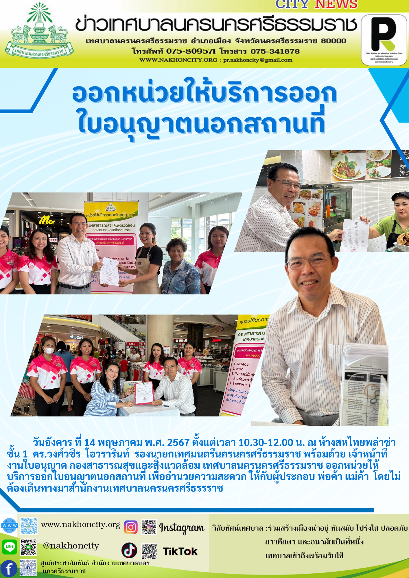 | วันอังคาร ที่ 14 พฤษภาคม พ.ศ. 2567 ตั้งแต่เวลา 10.30-12.00 น. ณ ห้างสหไทยพล่าซ่า ชั้น 1 ดร.วงศ์วชิร โอวรารินท์ รองนายกเทศมนตรีนครนครศรีธรรมราช พร้อมด้วย เจ้าหน้าที่งานใบอนุญาต กองสาธารณสุขและสิ่งแวดล้อม เทศบาลนครนครศรีธรรมราช ออกหน่วยให้บริการออกใบอนุญาตนอกสถานที่ เพื่ออำนวยความสะดวก ให้กับผู้ประกอบ พ่อค้า แม่ค้า โดยไม่ต้องเดินทางมาสำนักงานเทศบาลนครนครศรีธรรราช |