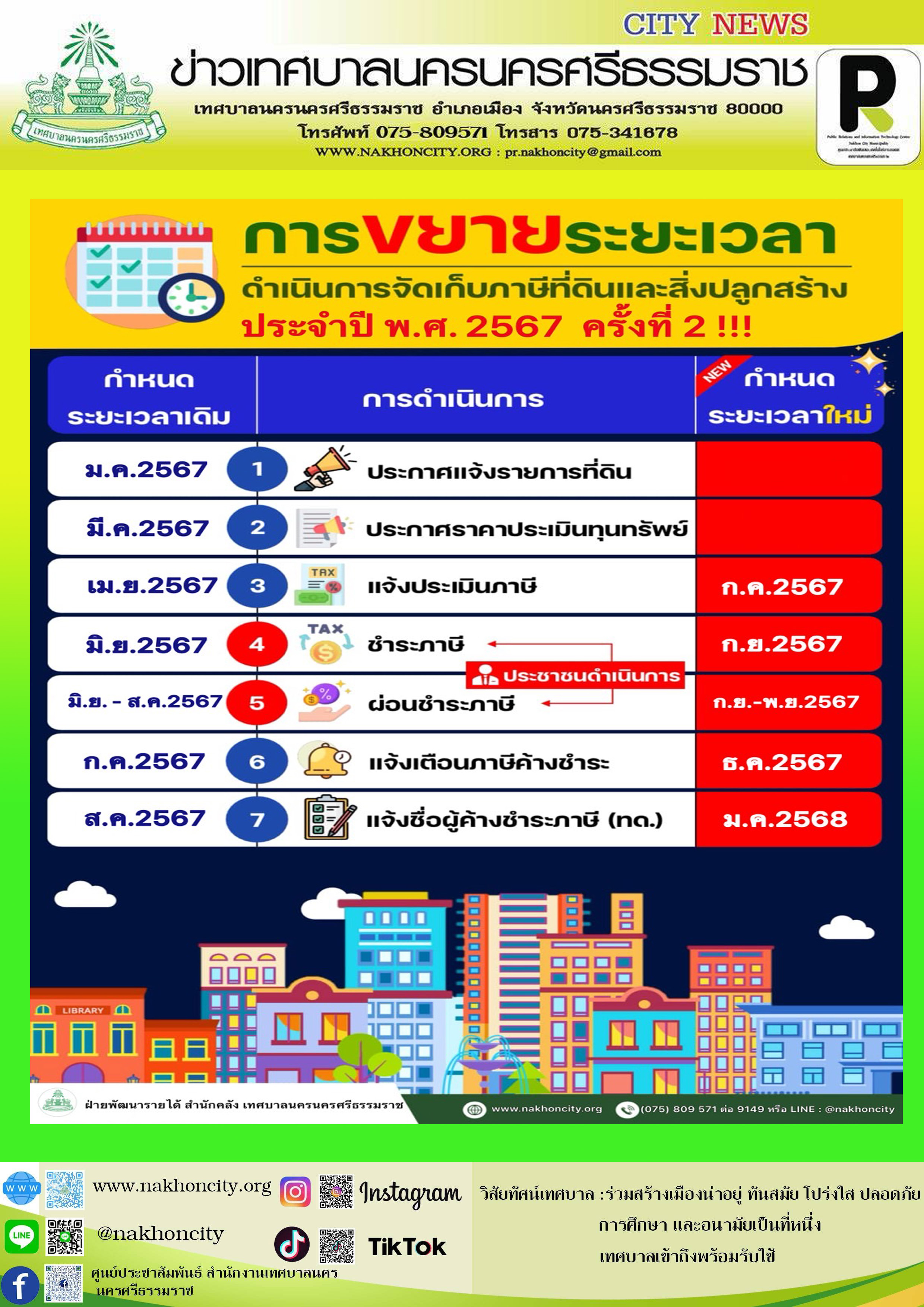 | เทศบาลนครนครศรีธรรมราช ขยายระยะเวลา ดำเนินการจัดเก็บภาษีที่ดินและสิ่งปลูกสร้าง ประจำปี พ.ศ.2567 ครั้งที่ 2 |