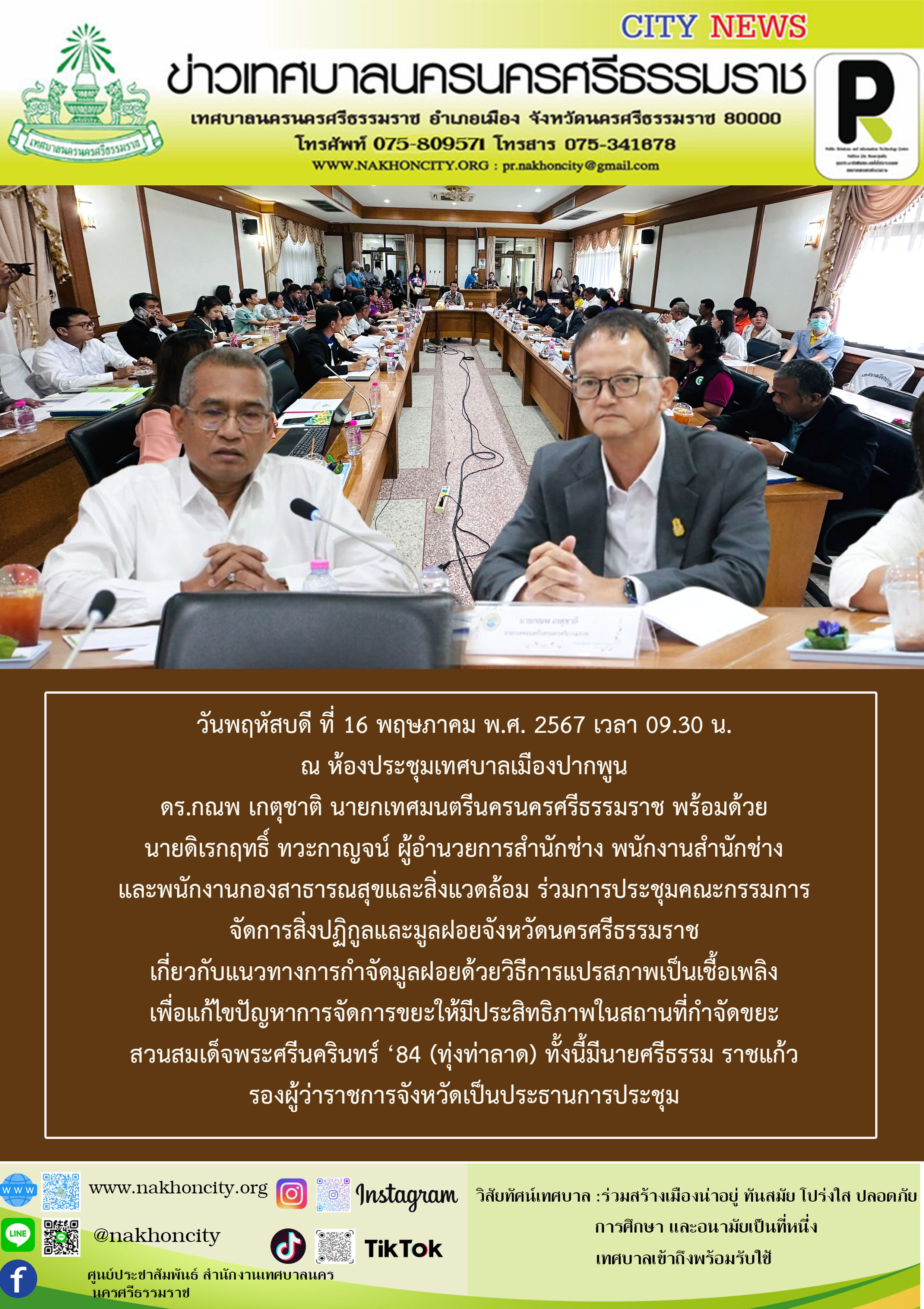 | ดร.กณพ เกตุชาติ นายกเทศมนตรีนครนครศรีธรรมราช พร้อมด้วย นายดิเรกฤทธิ์ ทวะกาญจน์ ผู้อำนวยการสำนักช่าง พนักงานสำนักช่าง และพนักงานกองสาธารณสุขและสิ่งแวดล้อม ร่วมการประชุมคณะกรรมการจัดการสิ่งปฏิกูลและมูลฝอยจังหวัดนครศรีธรรมราช |