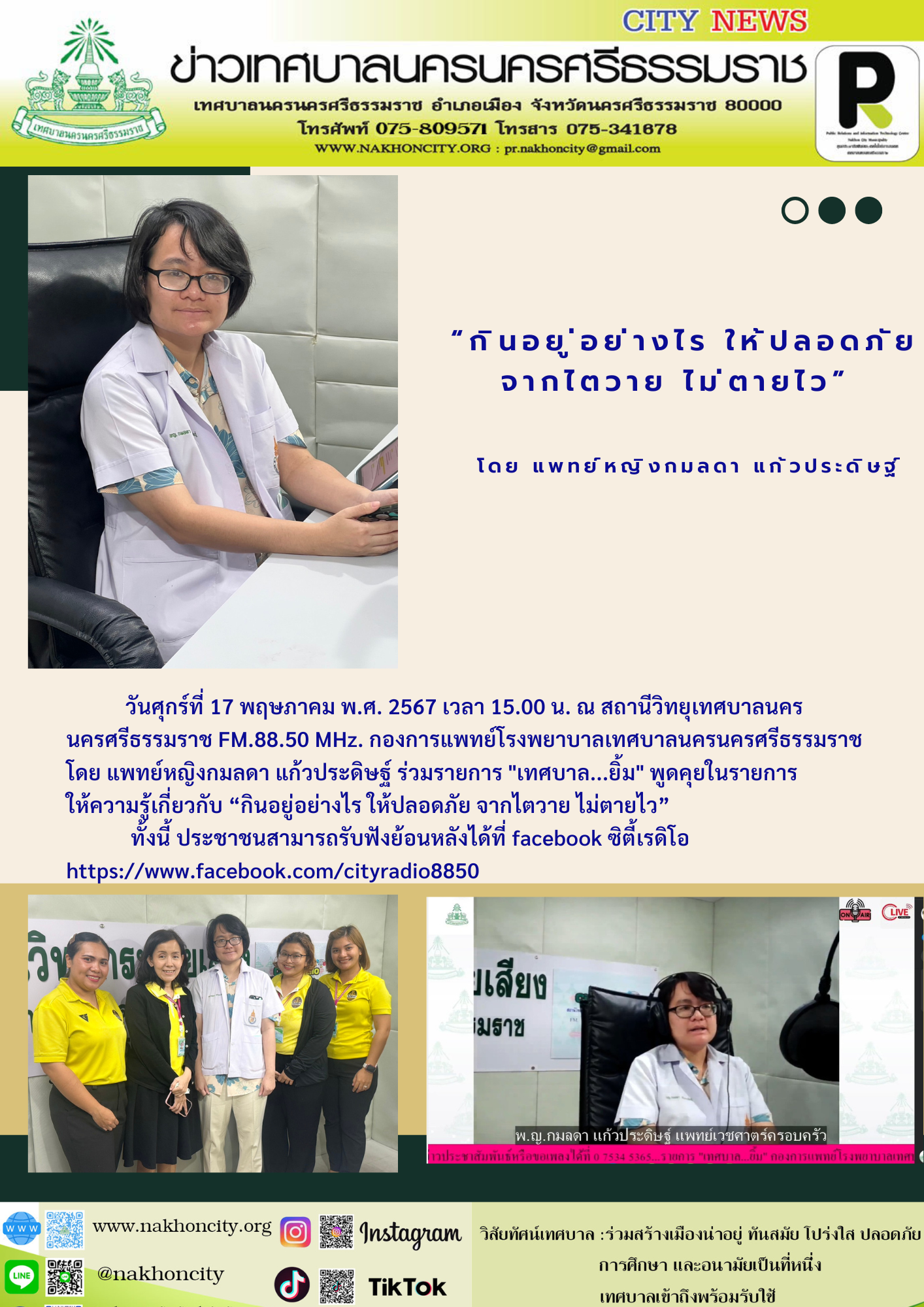 | กองการแพทย์โรงพยาบาลเทศบาลนครนครศรีธรรมราช โดย แพทย์หญิงกมลดา แก้วประดิษฐ์ ร่วมรายการ "เทศบาล...ยิ้ม" พูดคุยในรายการ ให้ความรู้เกี่ยวกับ “กินอยู่อย่างไร ให้ปลอดภัย จากไตวาย ไม่ตายไว” |