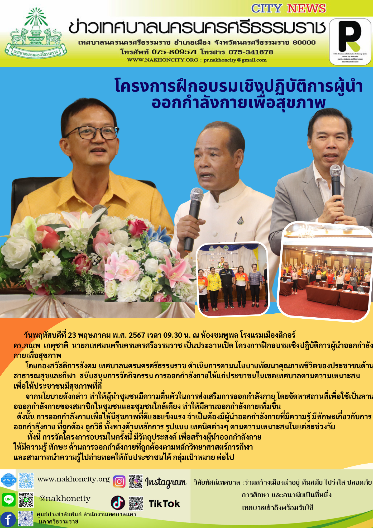 | วันพฤหัสบดีที่ 23 พฤษภาคม พ.ศ. 2567 เวลา 09.30 น. ณ ห้องชมพูพล โรงแรมเมืองลิกอร์ ดร.กณพ เกตุชาติ นายกเทศมนตรีนครนครศรีธรรมราช เป็นประธานเปิด โครงการฝึกอบรมเชิงปฏิบัติการผู้นำออกกำลังกายเพื่อสุขภาพ โดยกองสวัสดิการสังคม เทศบาลนครนครศรีธรรมราช ดำเนินการตามนโยบายพัฒนาคุณภาพชีวิตของประชาชนด้านสาธารณสุขและกีฬา สนับสนุนการจัดกิจกรรม การออกกำลังกายให้แก่ประชาชนในเขตเทศบาลตามความเหมาะสม เพื่อให้ประชาชนมีสุขภาพที่ดี จากนโยบายดังกล่าว ทำให้ผู้นำชุมชนมีความตื่นตัวในการส่งเสริมการออกกำลังกาย โดยจัดหาสถานที่เพื่อใช้เป็นลานอออกกำลังกายของสมาชิกในชุมชนและชุมชนใกล้เคียง ทำให้มีลานออกกำลังกายเพิ่มขึ้น ดังนั้น การออกกำลังกายเพื่อให้มีสุขภาพที่ดีและแข็งแรง จำเป็นต้องมีผู้นำออกกำลังกายที่มีความรู้ มีทักษะเกี่ยวกับการออกกำลังกาย ที่ถูกต้อง ถูกวิธี ทั้งทางด้านหลักการ รูปแบบ เทคนิคต่างๆ ตามความเหมาะสมในแต่ละช่วงวัย ทั้งนี้ การจัดโครงการอบรมในครั้งนี้ มีวัตถุประสงค์ เพื่อสร้างผู้นำออกกำลังกาย ให้มีความรู้ ทักษะ ด้านการออกกำลังกายที่ถูกต้องตามหลักวิทยาศาสตร์การกีฬา และสามารถนำความรู้ไปถ่ายทอดให้กับประชาชนได้ กลุ่มเป้าหมาย ต่อไป