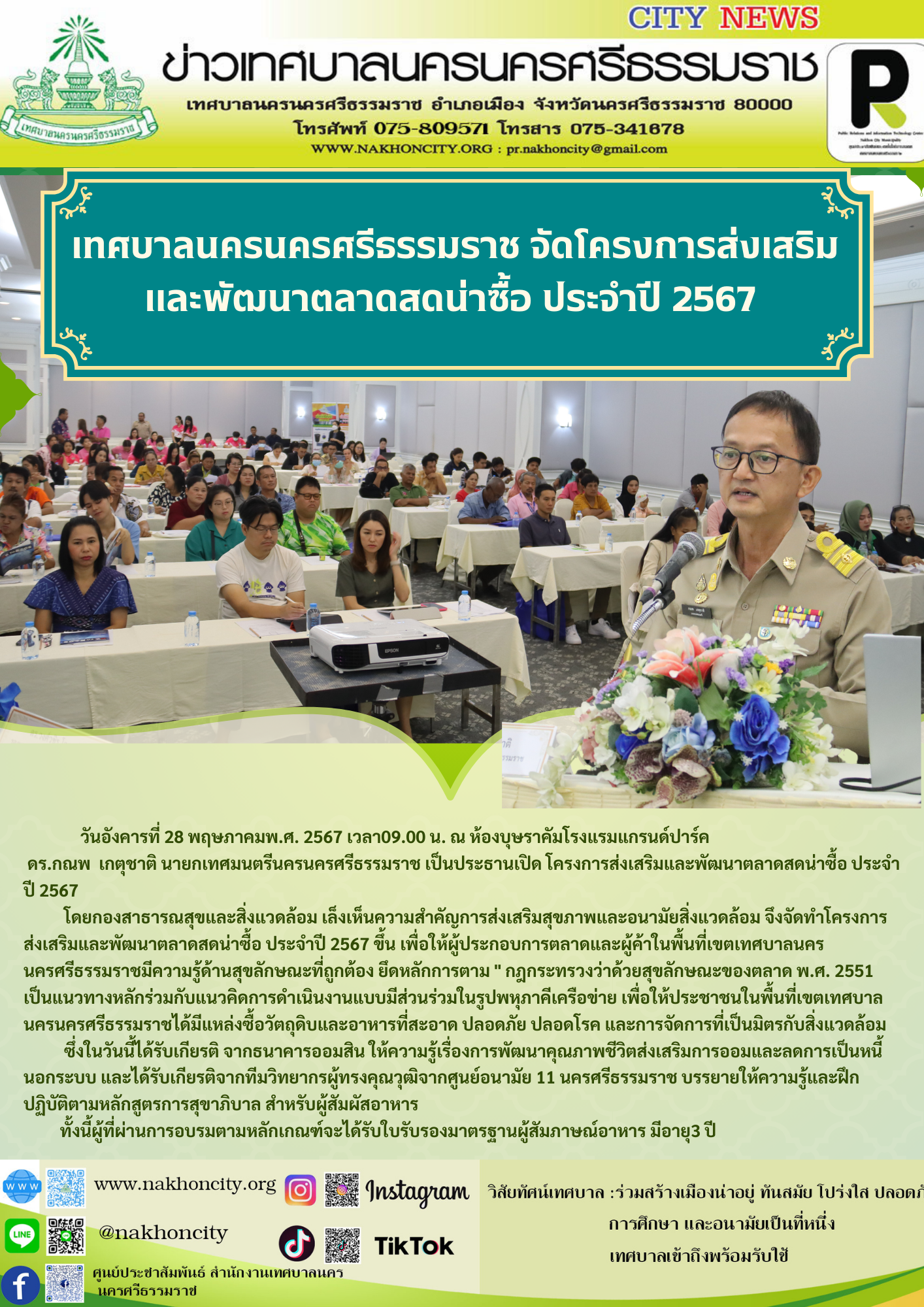 | เทศบาลนครนครศรีธรรมราช จัดโครงการส่งเสริมและพัฒนาตลาดสดน่าซื้อ ประจำปี 2567 |