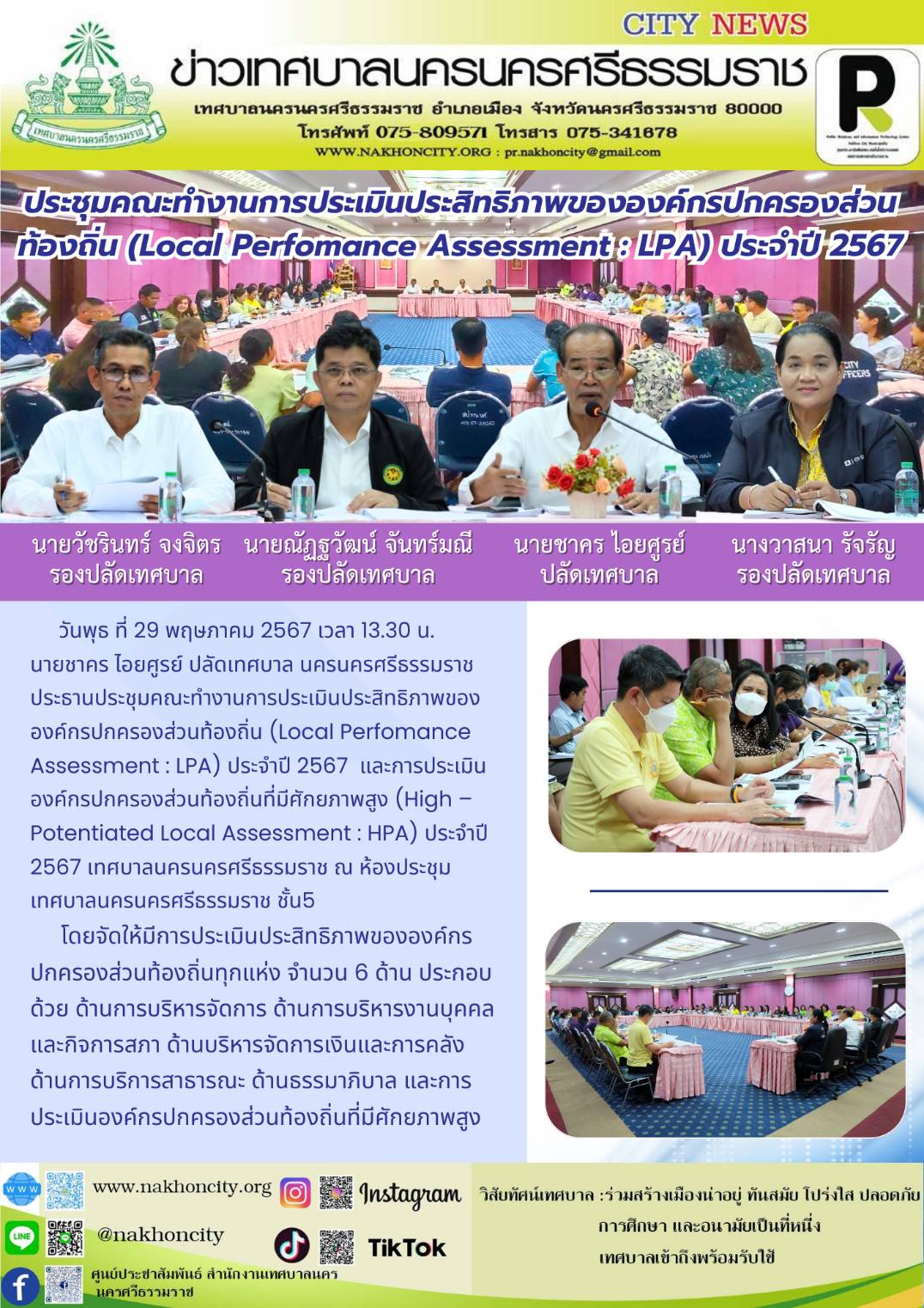 | นายชาคร ไอยศูรย์ ปลัดเทศบาล นครนครศรีธรรมราช ประธานประชุมคณะทำงานการประเมินประสิทธิภาพขององค์กรปกครองส่วนท้องถิ่น (Local Perfomance Assessment : LPA) ประจำปี 2567 และการประเมินองค์กรปกครองส่วนท้องถิ่นที่มีศักยภาพสูง (High – Potentiated Local Assessment : HPA) ประจำปี 2567 |