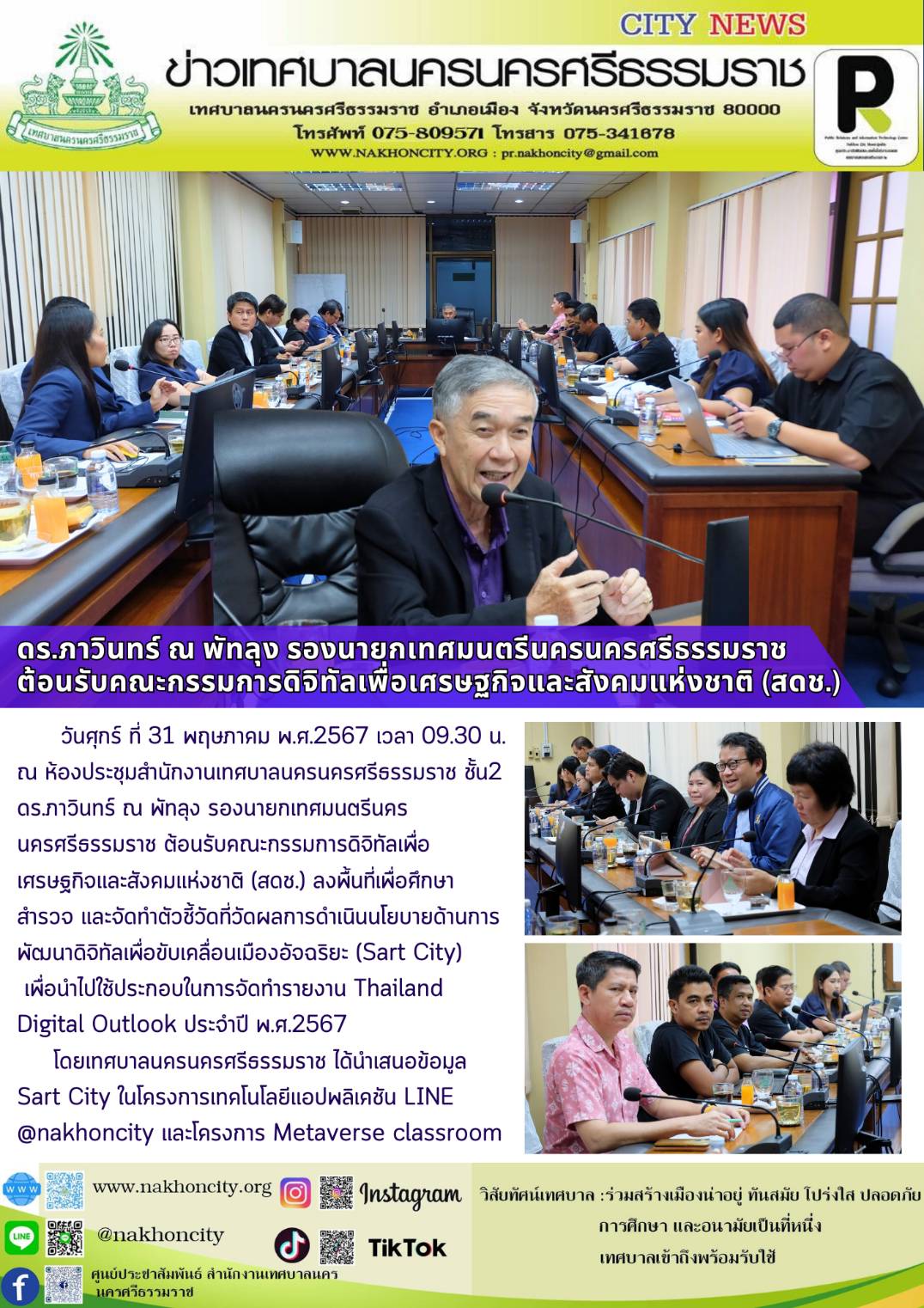 | ดร.ภาวินทร์ ณ พัทลุง รองนายกเทศมนตรีนครนครศรีธรรมราช ต้อนรับคณะกรรมการดิจิทัลเพื่อเศรษฐกิจและสังคมแห่งชาติ (สดช.) |
