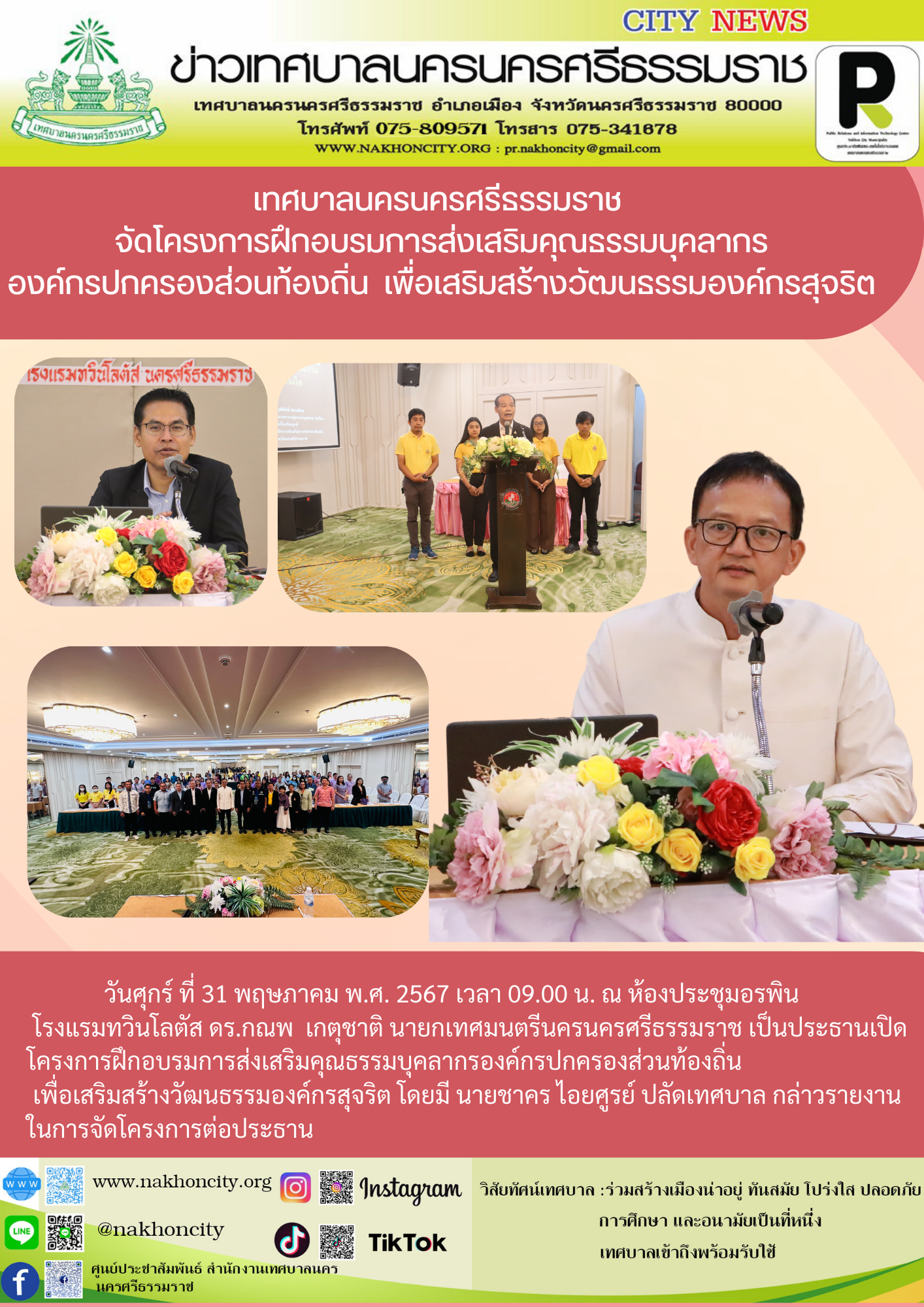 | เทศบาลนครนครศรีธรรมราช จัดโครงการฝึกอบรมการส่งเสริมคุณธรรมบุคลากรองค์กรปกครองส่วนท้องถิ่น เพื่อเสริมสร้างวัฒนธรรมองค์กรสุจริต |