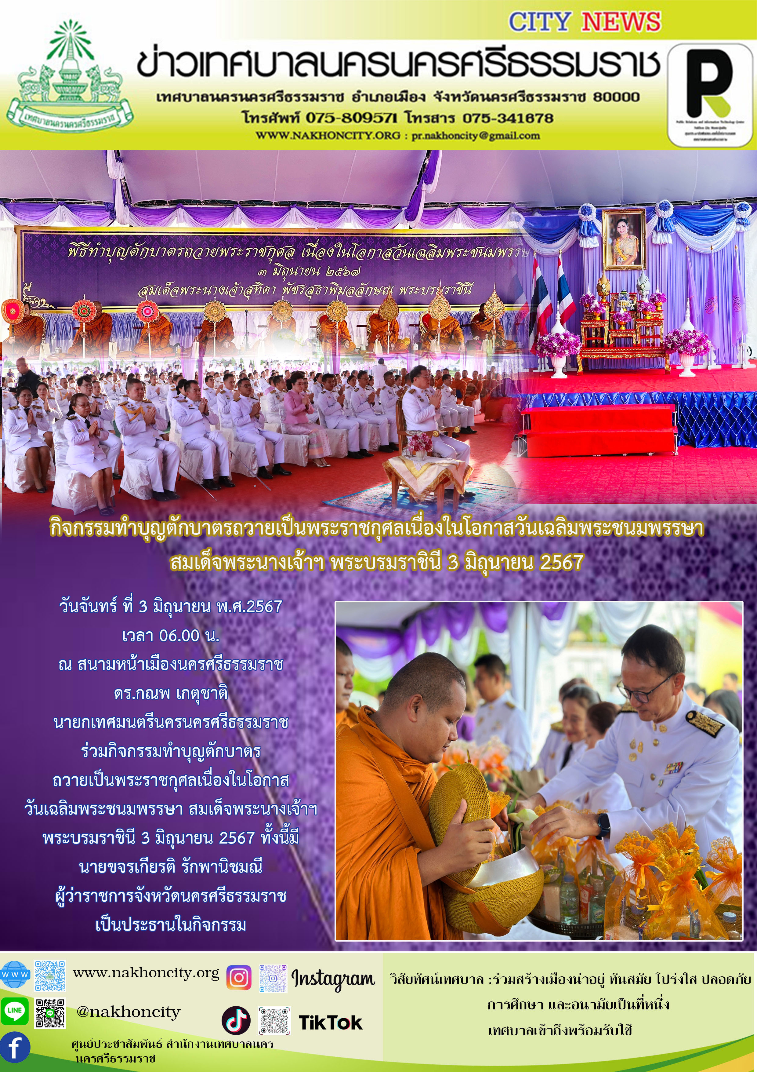 | เทศบาลนครนครศรีธรรมราช ร่วมกิจกรรมทำบุญตักบาตรถวายเป็นพระราชกุศลเนื่องในโอกาสวันเฉลิมพระชนมพรรษา สมเด็จพระนางเจ้าฯ พระบรมราชินี 3 มิถุนายน 2567 |