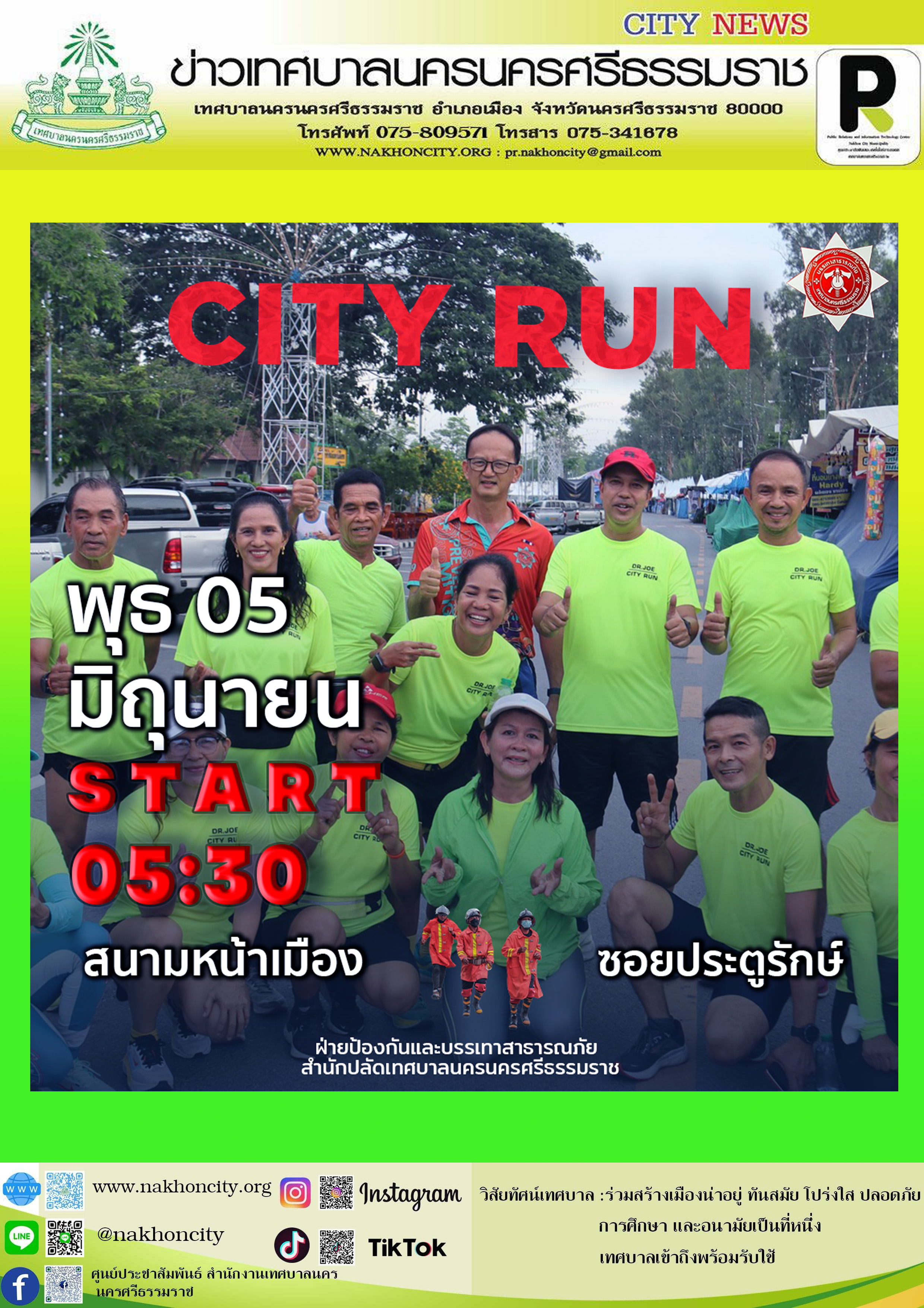 | เทศบาลนครนครศรีธรรมราช ขอเชิญประชาชนร่วมกิจกรรม วิ่ง “City Run วันพุธ” วันพุธที่ 5 มิถุนายน พ.ศ.2567 เวลา 05.30 น. ณ จุดนัดพบ สนามหน้าเมือง |