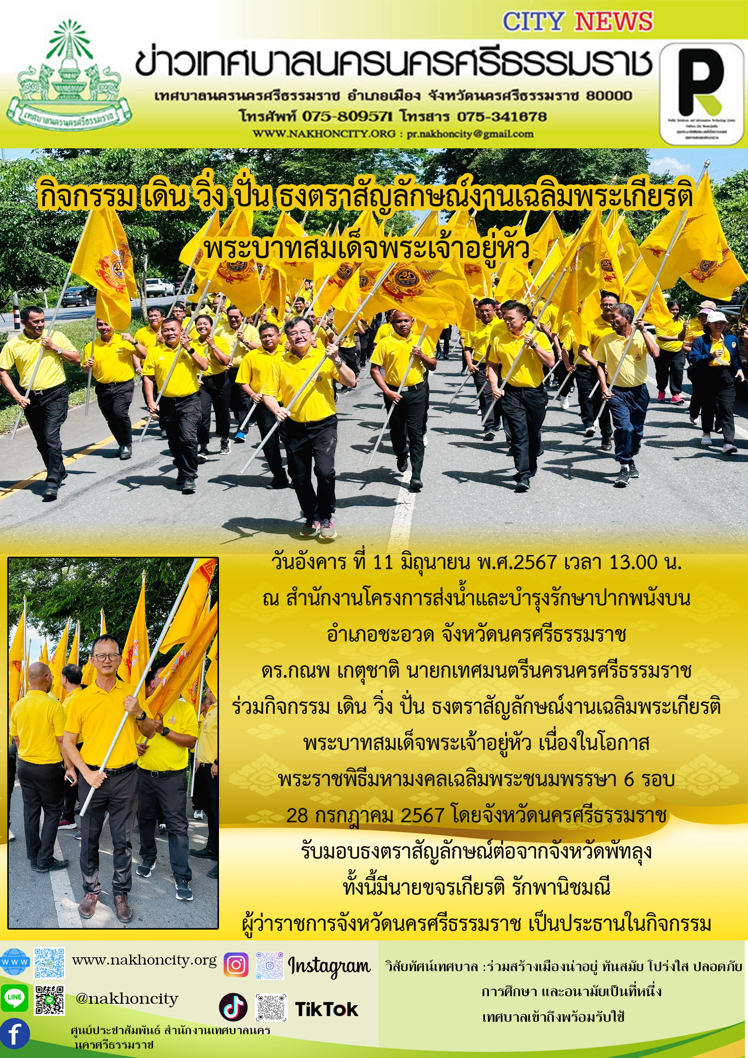 | นายกเทศมนตรีนครนครศรีธรรมราช ร่วมกิจกรรม เดิน วิ่ง ปั่น ธงตราสัญลักษณ์งานเฉลิมพระเกียรติ พระบาทสมเด็จพระเจ้าอยู่หัว เนื่องในโอกาสพระราชพิธีมหามงคลเฉลิมพระชนมพรรษา 6 รอบ 28 กรกฎาคม 2567 |
