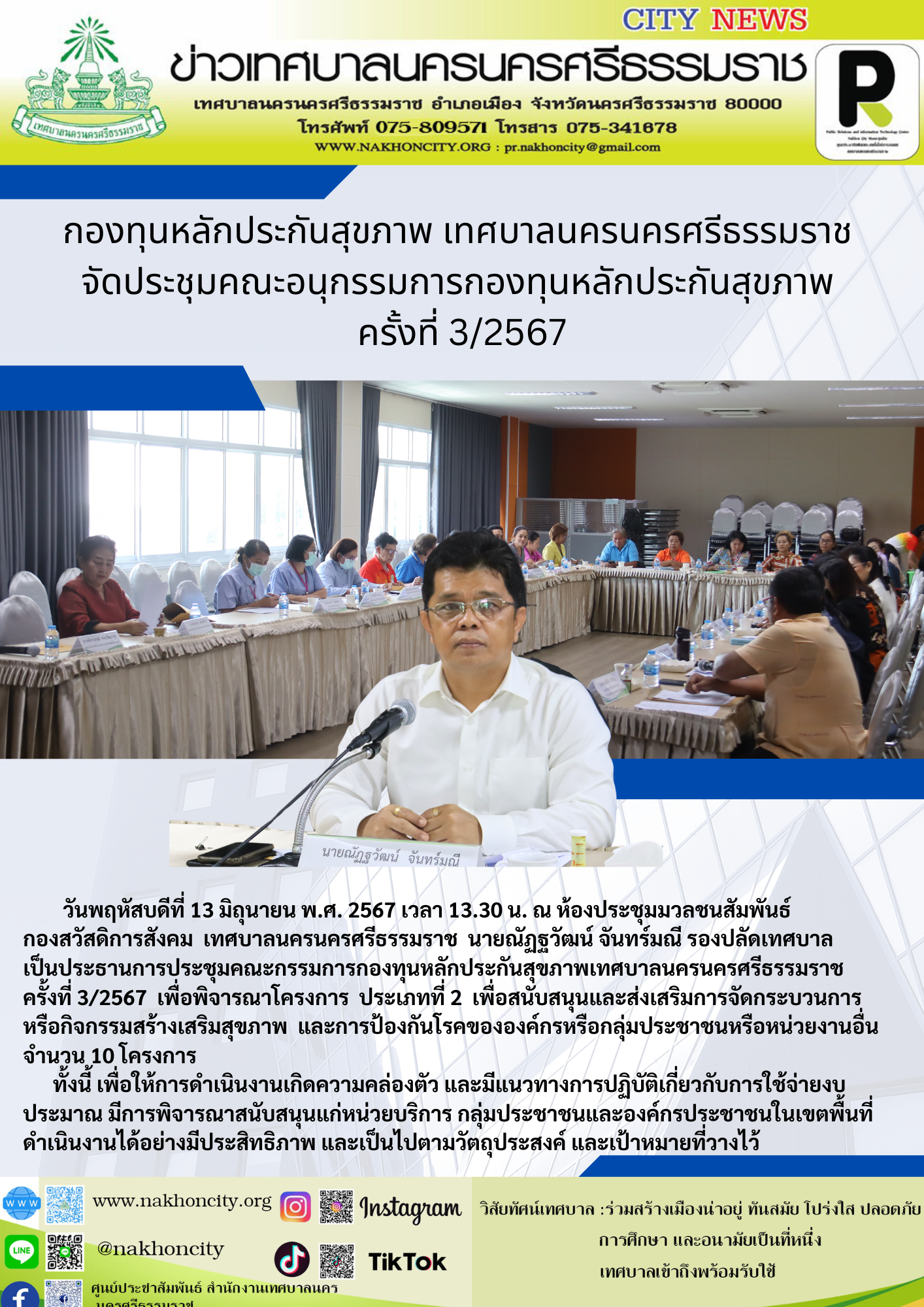 | กองทุนหลักประกันสุขภาพ เทศบาลนครนครศรีธรรมราช จัดประชุมคณะอนุกรรมการกองทุนหลักประกันสุขภาพ ครั้งที่ 3/2567 |