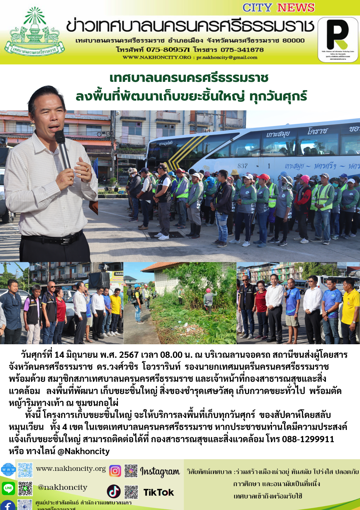 | วันศุกร์ที่ 14 มิถุนายน พ.ศ. 2567 เวลา 08.00 น. ณ บริเวณลานจอดรถ สถานีขนส่งผู้โดยสารจังหวัดนครศรีธรรมราช ดร.วงศ์วชิร โอวรารินท์ รองนายกเทศมนตรีนครนครศรีธรรมราช พร้อมด้วย สมาชิกสภาเทศบาลนครนครศรีธรรมราช และเจ้าหน้าที่กองสาธารณสุขและสิ่งแวดล้อม ลงพื้นที่พัฒนา เก็บขยะชิ้นใหญ่ สิ่งของชำรุดเศษวัสดุ เก็บกวาดขยะทั่วไป พร้อมตัดหญ้าริมทางเท้า ณ ชุมชนกอไผ่ ทั้งนี้ โครงการเก็บขยะชิ้นใหญ่ จะให้บริการลงพื้นที่เก็บทุกวันศุกร์ ของสัปดาห์โดยสลับหมุนเวียน ทั้ง 4 เขต ในเขตเทศบาลนครนครศรีธรรมราช หากประชาชนท่านใดมีความประสงค์แจ้งเก็บขยะชิ้นใหญ่ สามารถติดต่อได้ที่ กองสาธารณสุขและสิ่งแวดล้อม โทร 088-1299911 หรือ ทางไลน์ @Nakhoncity |