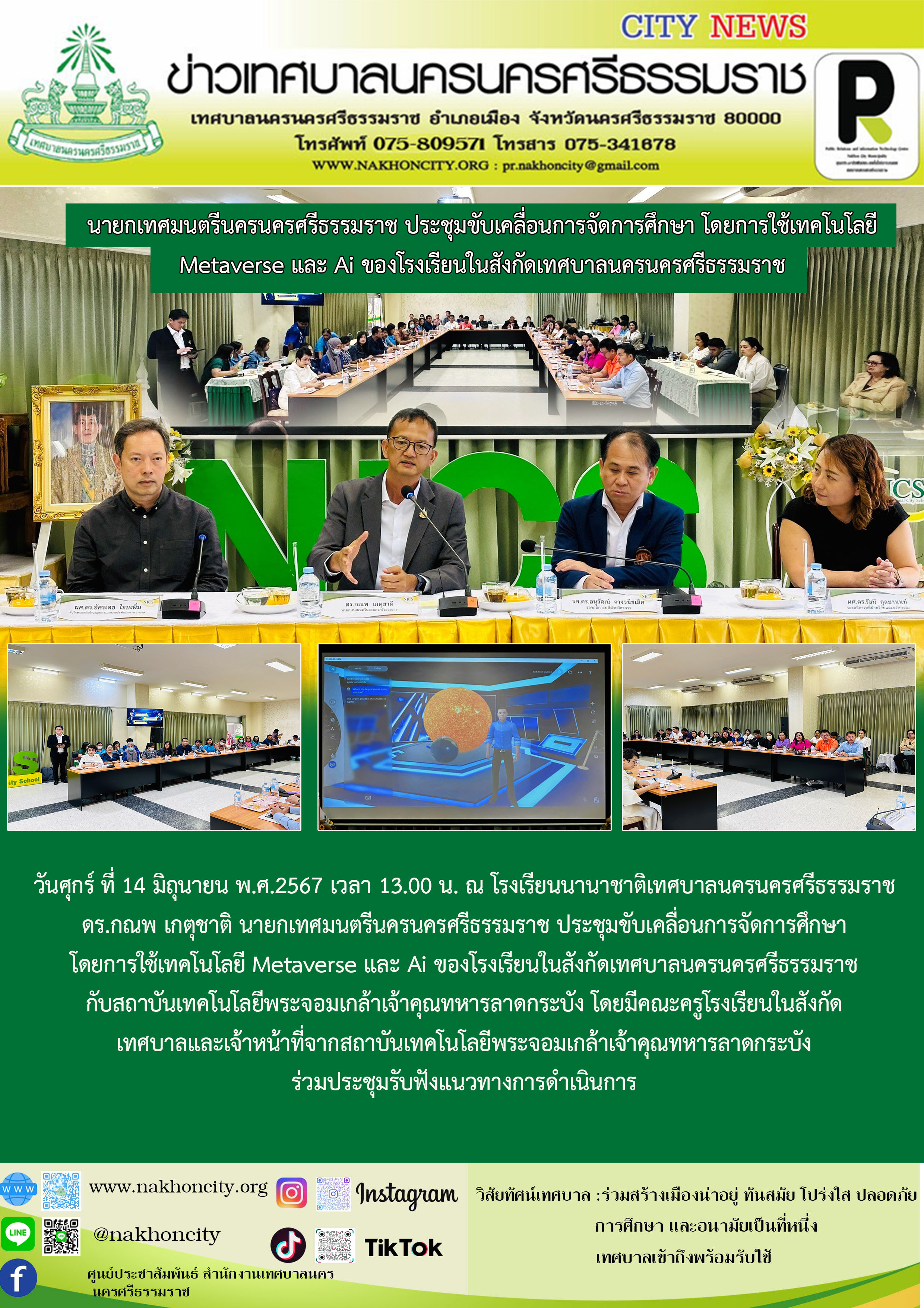 | นายกเทศมนตรีนครนครศรีธรรมราช ประชุมขับเคลื่อนการจัดการศึกษา โดยการใช้เทคโนโลยี Metaverse และ Ai ของโรงเรียนในสังกัดเทศบาลนครนครศรีธรรมราช กับสถาบันเทคโนโลยีพระจอมเกล้าเจ้าคุณทหารลาดกระบัง |