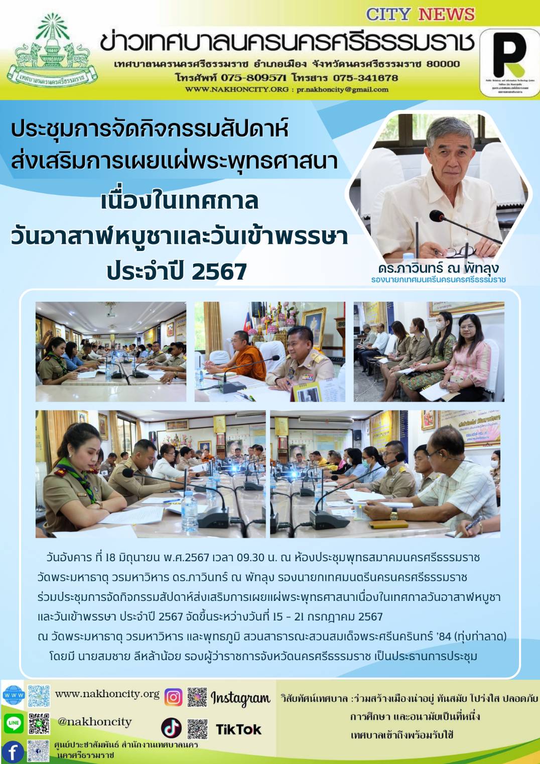 | ดร.ภาวินทร์ ณ พัทลุง รองนายกเทศมนตรีนครนครศรีธรรมราช ร่วมประชุมการจัดกิจกรรมสัปดาห์ส่งเสริมการเผยแผ่พระพุทธศาสนา เนื่องในเทศกาลวันอาสาฬหบูชาและวันเข้าพรรษา ประจำปี 2567 |