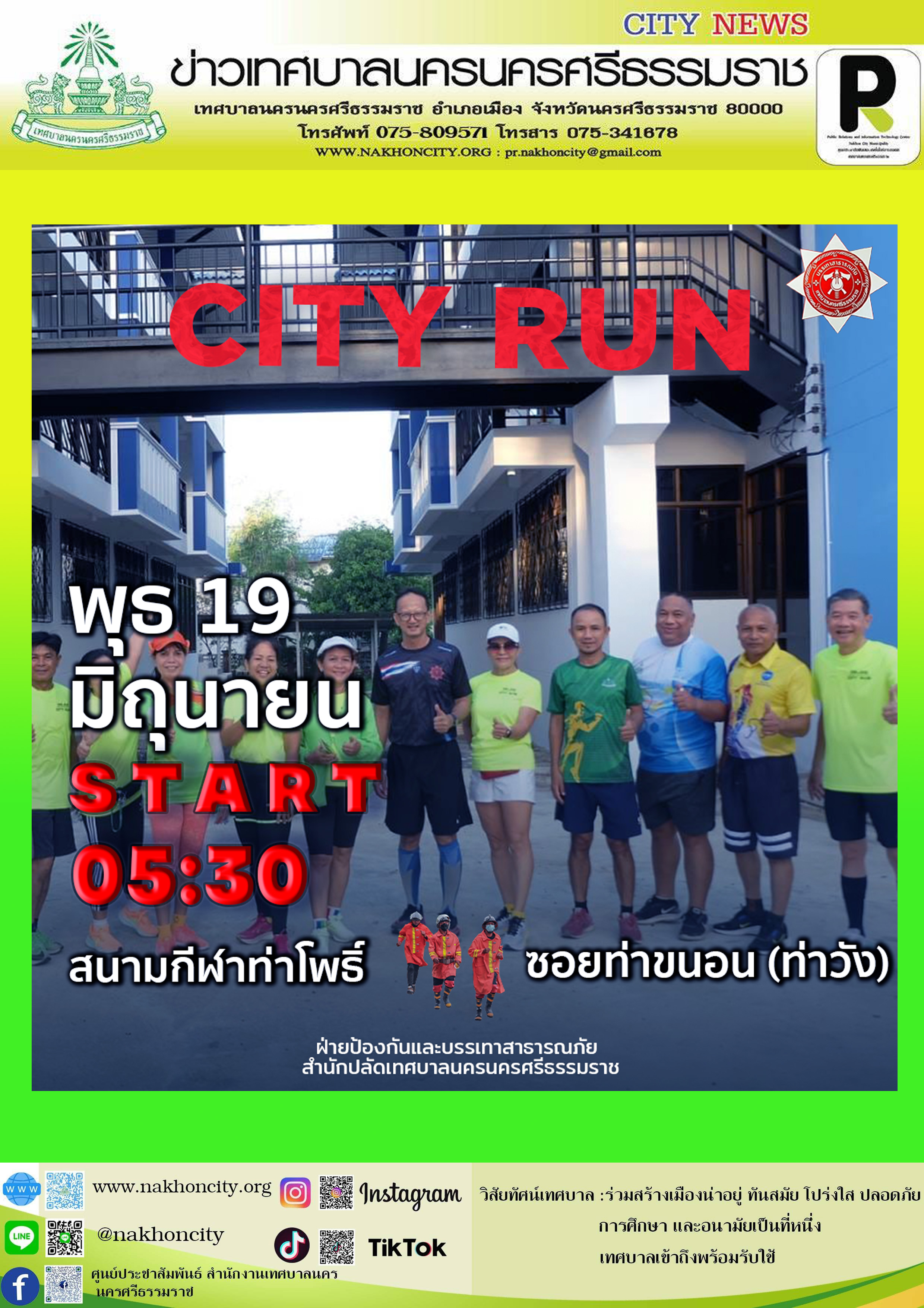 | กิจกรรม วิ่ง “City Run วันพุธ” วันพุธที่ 19 มิถุนายน พ.ศ.2567 เวลา 05.30 น. ณ จุดนัดพบ สนามกีฬาท่าโพธิ์ |