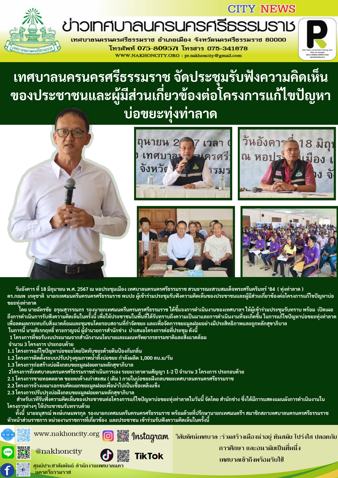 วันอังคาร ที่ 18 มิถุนายน พ.ศ. 2567 ณ หอประชุมเมือง เทศบาลนครนครศรีธรรมราช สวนธารณะสวนสมเด็จพระศรีนครินทร์ ‘84 ( ทุ่งท่าลาด ) ดร.กณพ เกตุชาติ นายกเทศมนตรีนครนครศรีธรรมราช พบปะ ผู้เข้าร่วมประชุมรับฟังความคิดเห็นของประชาชนและผู้มีส่วนเกี่ยวข้องต่อโครงการแก้ไขปัญหาบ่อขยะทุ่งท่าลาด โดย นายฉัตรชัย อรุณสุวรรณกร รองนายกเทศมนตรีนครนครศรีธรรมราช ได้ชี้แจงการดำเนินงานของเทศบาลฯ ให้ผู้เข้าร่วมประชุมรับทราบ พร้อม เปิดเผยถึงการดำเนินการรับฟังความคิดเห็นในครั้งนี้ เพื่อให้ประชาชนในพื้นที่ได้รับทราบถึงความเป็นมาและการดำเนินงานที่จะเกิดขึ้น ในการแก้ไขปัญหาบ่อขยะทุ่งท่าลาด เพื่อลดผลกระทบกับสิ่งแวดล้อมและชุมชนโดยรอบสถานที่กำจัดขยะ และเพื่อจัดการขยะมูลฝอยอย่างมีประสิทธิภาพและถูกหลักสุขาภิบาล ในการนี้ นายดิเรกฤทธิ์ ทวะกาญจน์ ผู้อำนวยการสำนักช่าง นำเสนอโครงการต่อที่ประชุม ดังนี้ 1 โครงการที่ขอรับงบประมาณจากสำนักงานนโยบายและแผนทรัพยากรธรรมชาติและสิ่งแวดล้อม จำนวน 3 โครงการ ประกอบด้วย 1.1 โครงการแก้ไขปัญหาบ่อขยะโดยปิดทับขยะด้วยดินป้องกันกลิ่น 1.2 โครงการติดตั้งระบบปรับปรุงคุณภาพน้ำทิ้งบ่อขยะ กำลังผลิต 1,000 ลบ.ม/วัน 1.3 โครงการก่อสร้างบ่อฝังกลบขยะมูลฝอยตามหลักสุขาภิบาล 2โครงการที่เทศบาลนครนครศรีธรรมราชดำเนินการเอง ระยะเวลาตามสัญญา 1-2 ปี จำนวน 3 โครงการ ประกอบด้วย 2.1 โครงการขายทอดตลาด ขยะตกค้างเก่าสะสม ( เดิม ) ภายในบ่อขยะฝังกลบขยะเทศบาลนครนครศรีธรรมราช 2.2 โครงการจ้างเหมาเอกชนคัดแยกขยะมูลฝอยเพื่อนำไปเป็นเชื้อเพลิงแข็ง 2.3 โครงการปรับปรุงบ่อฝังกลบขยะมูลฝอยตามหลักสุขาภิบาล สำหรับเวทีรับฟังความคิดเห็นของประชาชนต่อโครงการแก้ไขปัญหาบ่อขยะทุ่งท่าลาดในวันนี้ จัดโดย สำนักช่าง ซึ่งได้มีการแสดงแผนผังการดำเนินงานในโครงการต่างๆ ให้ประชาชนรับทราบด้วย