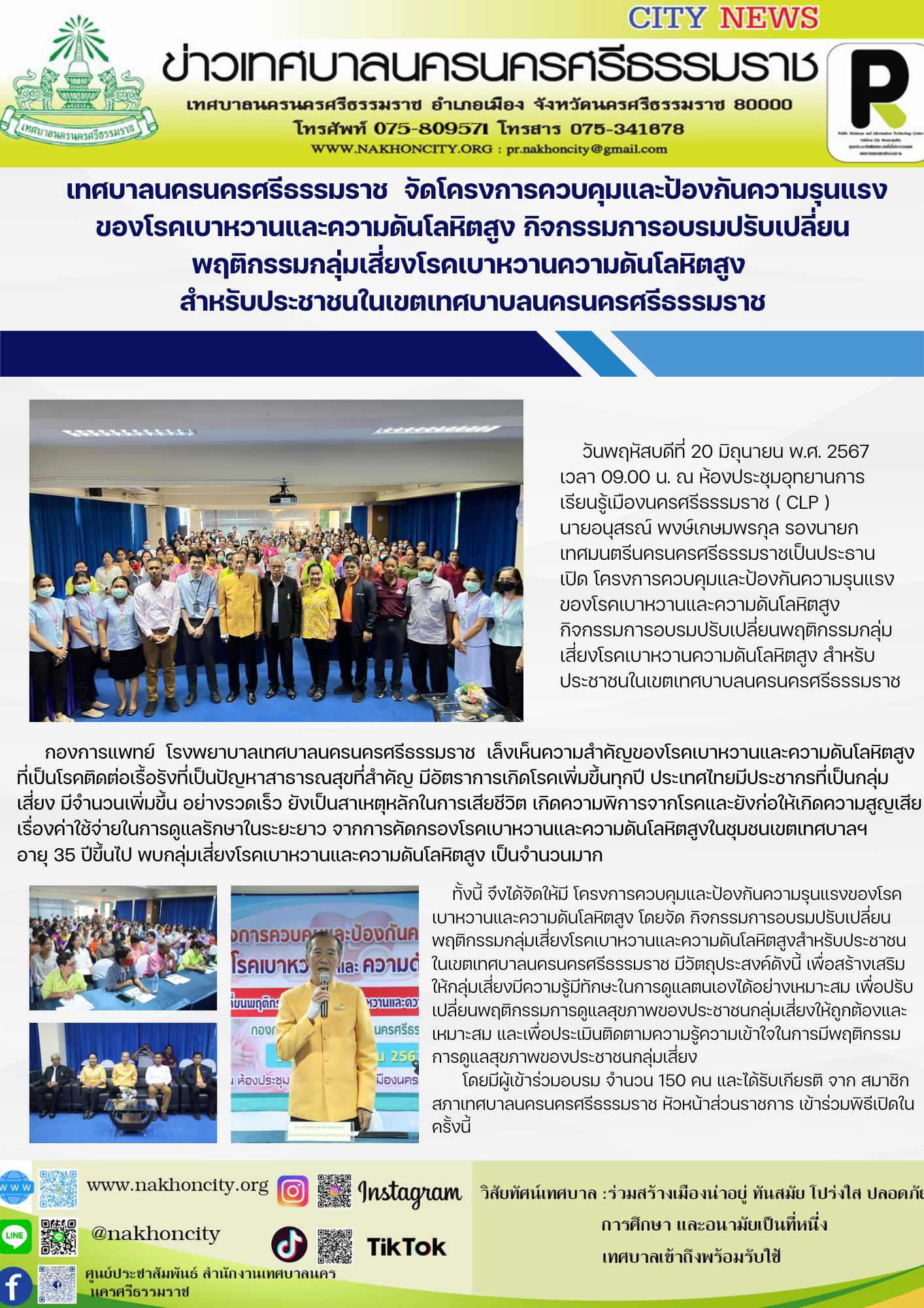 | วันพฤหัสบดีที่ 20 มิถุนายน พ.ศ. 2567 เวลา 09.00 น. ณ ห้องประชุมอุทยานการเรียนรู้เมืองนครศรีธรรมราช ( CLP ) นายอนุสรณ์ พงษ์เกษมพรกุล รองนายกเทศมนตรีนครนครศรีธรรมราช เป็นประธานเปิด โครงการควบคุมและป้องกันความรุนแรงของโรคเบาหวานและความดันโลหิตสูง กิจกรรมการอบรมปรับเปลี่ยนพฤติกรรมกลุ่มเสี่ยงโรคเบาหวานความดันโลหิตสูง สำหรับประชาชนในเขตเทศบาบลนครนครศรีธรรมราช กองการแพทย์ โรงพยาบาลเทศบาลนครนครศรีธรรมราช เล็งเห็นความสำคัญของโรคเบาหวานและความดันโลหิตสูง ที่เป็นโรคติดต่อเรื้อรังที่เป็นปัญหาสาธารณสุขที่สำคัญ มีอัตราการเกิดโรคเพิ่มขึ้นทุกปี ประเทศไทยมีประชากรที่เป็นกลุ่มเสี่ยง มีจำนวนเพิ่มขึ้น อย่างรวดเร็ว ยังเป็นสาเหตุหลักในการเสียชีวิต เกิดความพิการจากโรคและยังก่อให้เกิดความสูญเสีย เรื่องค่าใช้จ่ายในการดูแลรักษาในระยะยาว จากการคัดกรองโรคเบาหวานและความดันโลหิตสูงในชุมชนเขตเทศบาลฯ อายุ 35 ปีขึ้นไป พบกลุ่มเสี่ยงโรคเบาหวานและความดันโลหิตสูง เป็นจำนวนมาก ทั้งนี้ จึงได้จัดให้มี โครงการควบคุมและป้องกันความรุนแรงของโรคเบาหวานและความดันโลหิตสูง โดยจัด กิจกรรมการอบรมปรับเปลี่ยนพฤติกรรมกลุ่มเสี่ยงโรคเบาหวานและความดันโลหิตสูงสำหรับประชาชนในเขตเทศบาลนครนครศรีธรรมราช มีวัตถุประสงค์ดังนี้ เพื่อสร้างเสริมให้กลุ่มเสี่ยงมีความรู้มีทักษะในการดูแลตนเองได้อย่างเหมาะสม เพื่อปรับเปลี่ยนพฤติกรรมการดูแลสุขภาพของประชาชนกลุ่มเสี่ยงให้ถูกต้องและเหมาะสม และเพื่อประเมินติดตามความรู้ความเข้าใจในการมีพฤติกรรมการดูแลสุขภาพของประชาชนกลุ่มเสี่ยง โดยมีผู้เข้าร่วมอบรม จำนวน 150 คน และได้รับเกียรติ จาก สมาชิกสภาเทศบาลนครนครศรีธรรมราช หัวหน้าส่วนราชการ เข้าร่วมพิธีเปิดในครั้งนี้ |