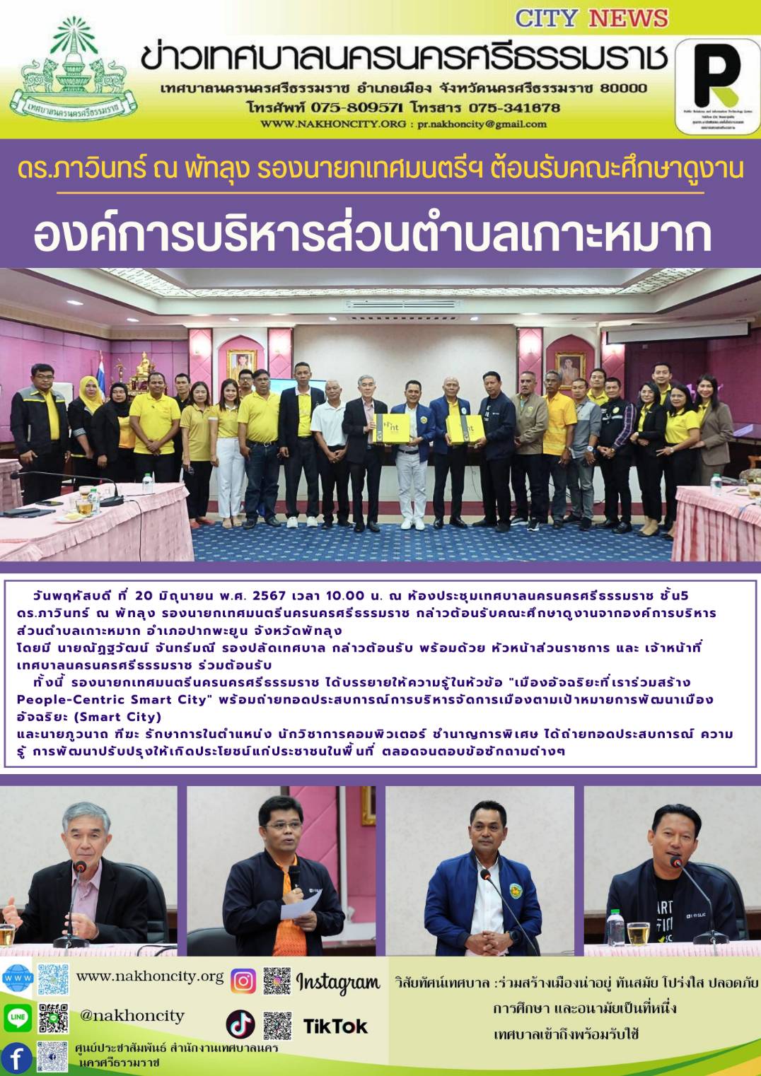 | วันพฤหัสบดี ที่ 20 มิถุนายน พ.ศ. 2567 เวลา 10.00 น. ณ ห้องประชุมเทศบาลนครนครศรีธรรมราช ชั้น5 ดร.ภาวินทร์ ณ พัทลุง รองนายกเทศมนตรีนครนครศรีธรรมราช กล่าวต้อนรับคณะศึกษาดูงานจากองค์การบริหารส่วนตำบลเกาะหมาก อำเภอปากพะยูน จังหวัดพัทลุง โดยมี นายณัฏฐวัฒน์ จันทร์มณี รองปลัดเทศบาล กล่าวต้อนรับ พร้อมด้วย หัวหน้าส่วนราชการ และ เจ้าหน้าที่เทศบาลนครนครศรีธรรมราช ร่วมต้อนรับ ทั้งนี้ รองนายกเทศมนตรีนครนครศรีธรรมราช ได้บรรยายให้ความรู้ในห้วข้อ "เมืองอัจฉริยะที่เราร่วมสร้าง People-Centric Smart City" พร้อมถ่ายทอดประสบการณ์การบริหารจัดการเมืองตามเป้าหมายการพัฒนาเมืองอัจฉริยะ (Smart City) และนายภูวนาถ ฑีฆะ รักษาการในตำแหน่ง นักวิชาการคอมพิวเตอร์ ชำนาญการพิเศษ ได้ถ่ายทอดประสบการณ์ ความรู้ การพัฒนาปรับปรุงให้เกิดประโยชน์แก่ประชาชนในพื้นที่ ตลอดจนตอบข้อซักถามต่างๆ ............... ภาพ//จันทร์จิรา//จิรภัทร ข่าว//จันทร์จิรา |