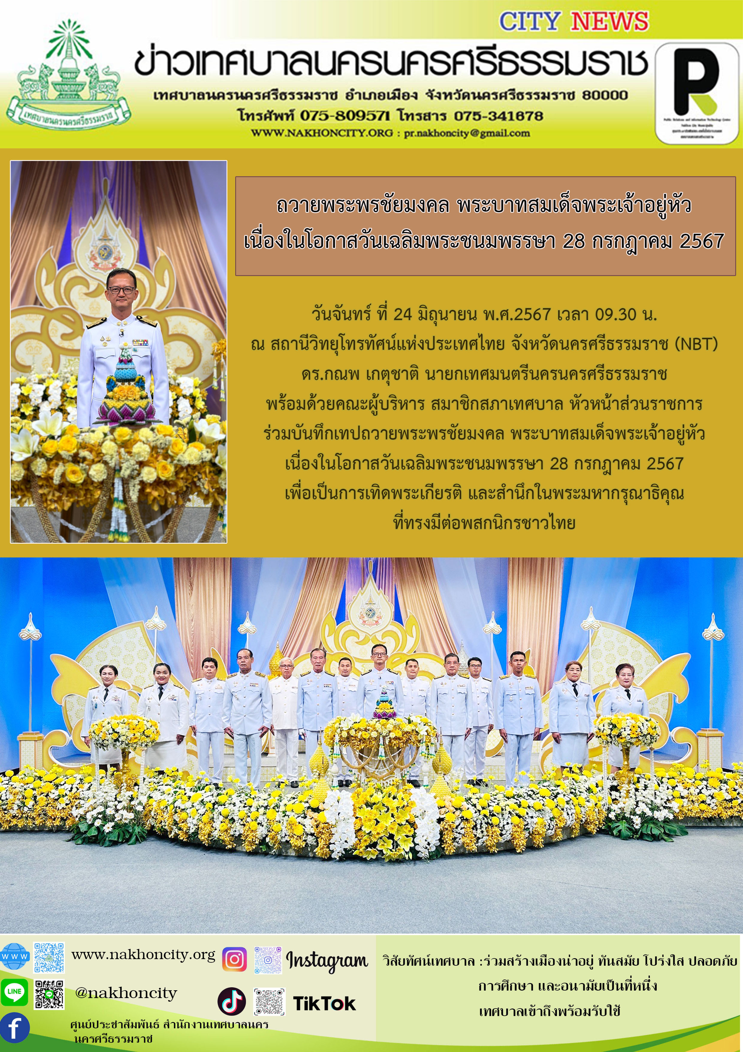| นายกเทศมนตรีนครนครศรีธรรมราช พร้อมด้วยคณะผู้บริหาร สมาชิกสภาเทศบาล หัวหน้าส่วนราชการ ร่วมบันทึกเทปถวายพระพรชัยมงคล พระบาทสมเด็จพระเจ้าอยู่หัว เนื่องในโอกาสวันเฉลิมพระชนมพรรษา 28 กรกฎาคม 2567 |