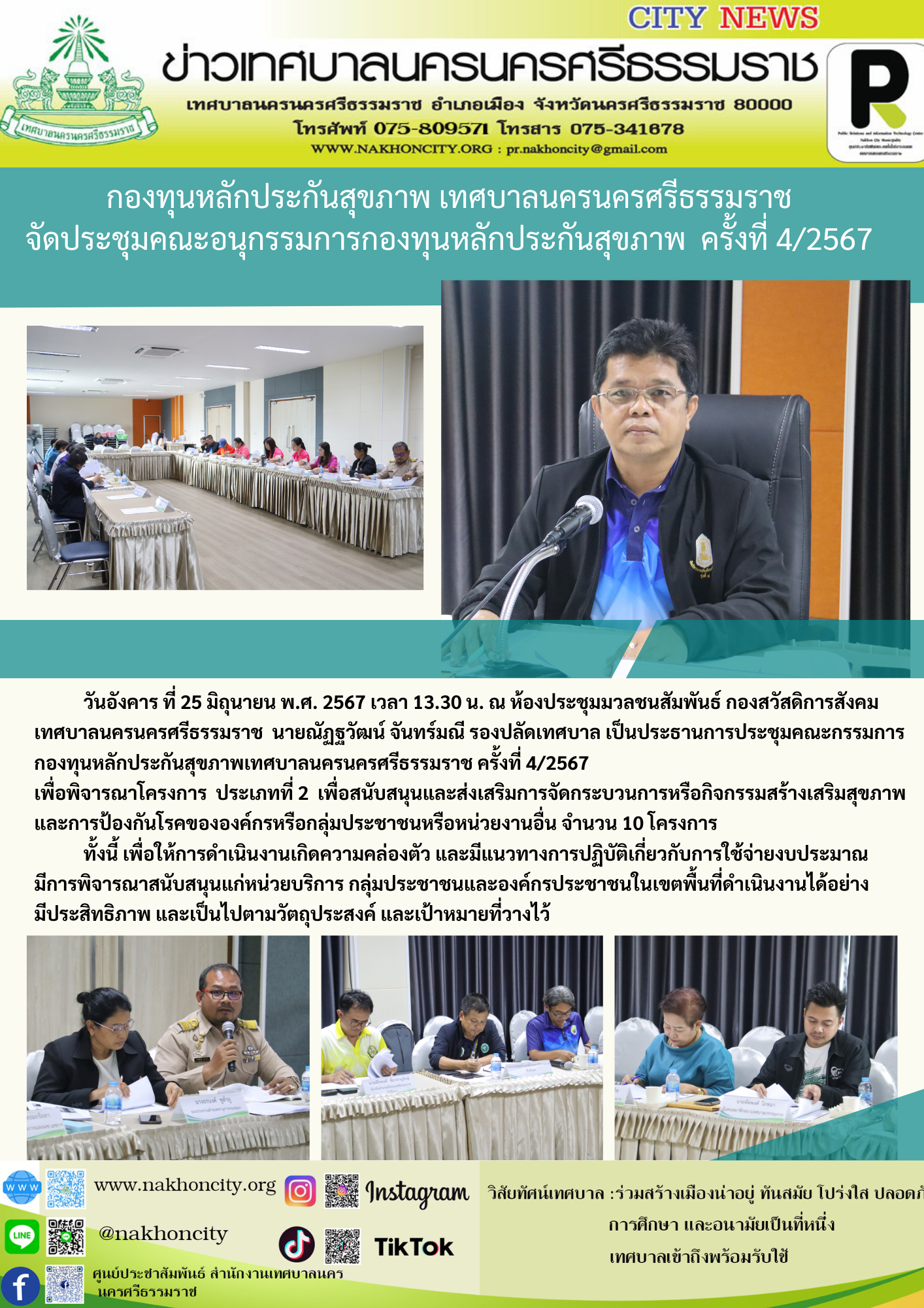 | กองทุนหลักประกันสุขภาพ เทศบาลนครนครศรีธรรมราช จัดประชุมคณะอนุกรรมการกองทุนหลักประกันสุขภาพ ครั้งที่ 4/2567 วันอังคาร ที่ 25 มิถุนายน พ.ศ. 2567 เวลา 13.30 น. ณ ห้องประชุมมวลชนสัมพันธ์ กองสวัสดิการสังคม เทศบาลนครนครศรีธรรมราช นายณัฏฐวัฒน์ จันทร์มณี รองปลัดเทศบาล เป็นประธานการประชุมคณะกรรมการกองทุนหลักประกันสุขภาพเทศบาลนครนครศรีธรรมราช ครั้งที่ 4/2567 เพื่อพิจารณาโครงการ ประเภทที่ 2 เพื่อสนับสนุนและส่งเสริมการจัดกระบวนการหรือกิจกรรมสร้างเสริมสุขภาพ และการป้องกันโรคขององค์กรหรือกลุ่มประชาชนหรือหน่วยงานอื่น จำนวน 10 โครงการ ทั้งนี้ เพื่อให้การดำเนินงานเกิดความคล่องตัว และมีแนวทางการปฏิบัติเกี่ยวกับการใช้จ่ายงบประมาณ มีการพิจารณาสนับสนุนแก่หน่วยบริการ กลุ่มประชาชนและองค์กรประชาชนในเขตพื้นที่ดำเนินงานได้อย่างมีประสิทธิภาพ และเป็นไปตามวัตถุประสงค์ และเป้าหมายที่วางไว้ |