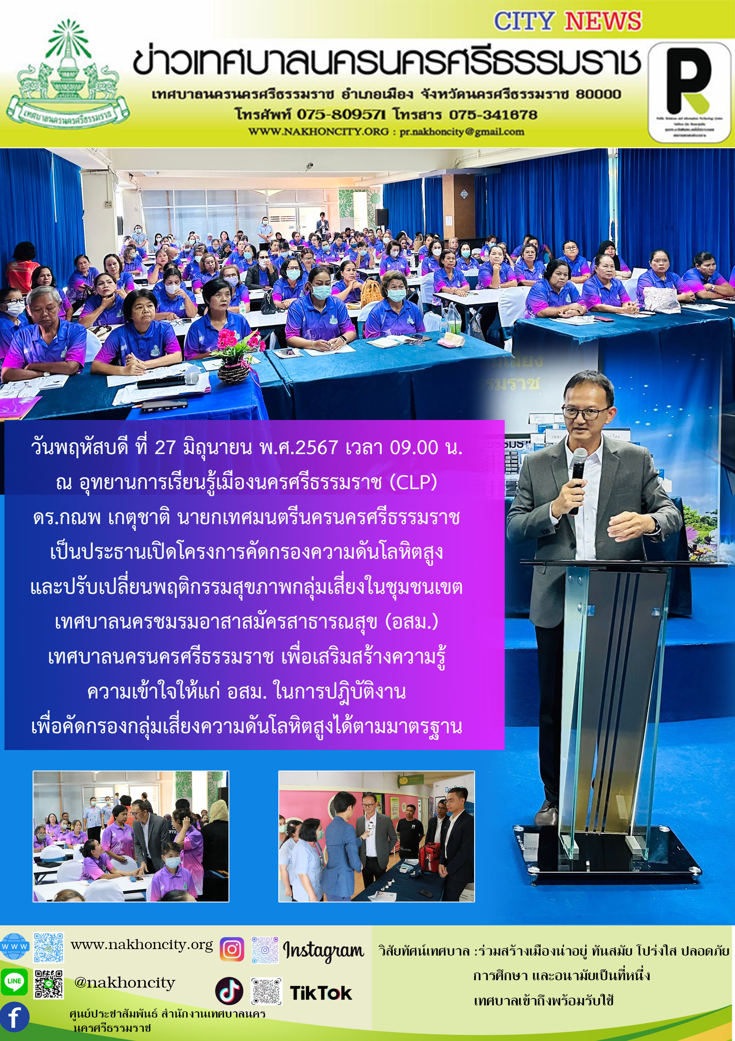 | นายกเทศมนตรีนครนครศรีธรรมราช เป็นประธานเปิดโครงการคัดกรองความดันโลหิตสูงและปรับเปลี่ยนพฤติกรรมสุขภาพกลุ่มเสี่ยงในชุมชนเขตเทศบาลนครชมรมอาสาสมัครสาธารณสุข (อสม.) เทศบาลนครนครศรีธรรมราช |