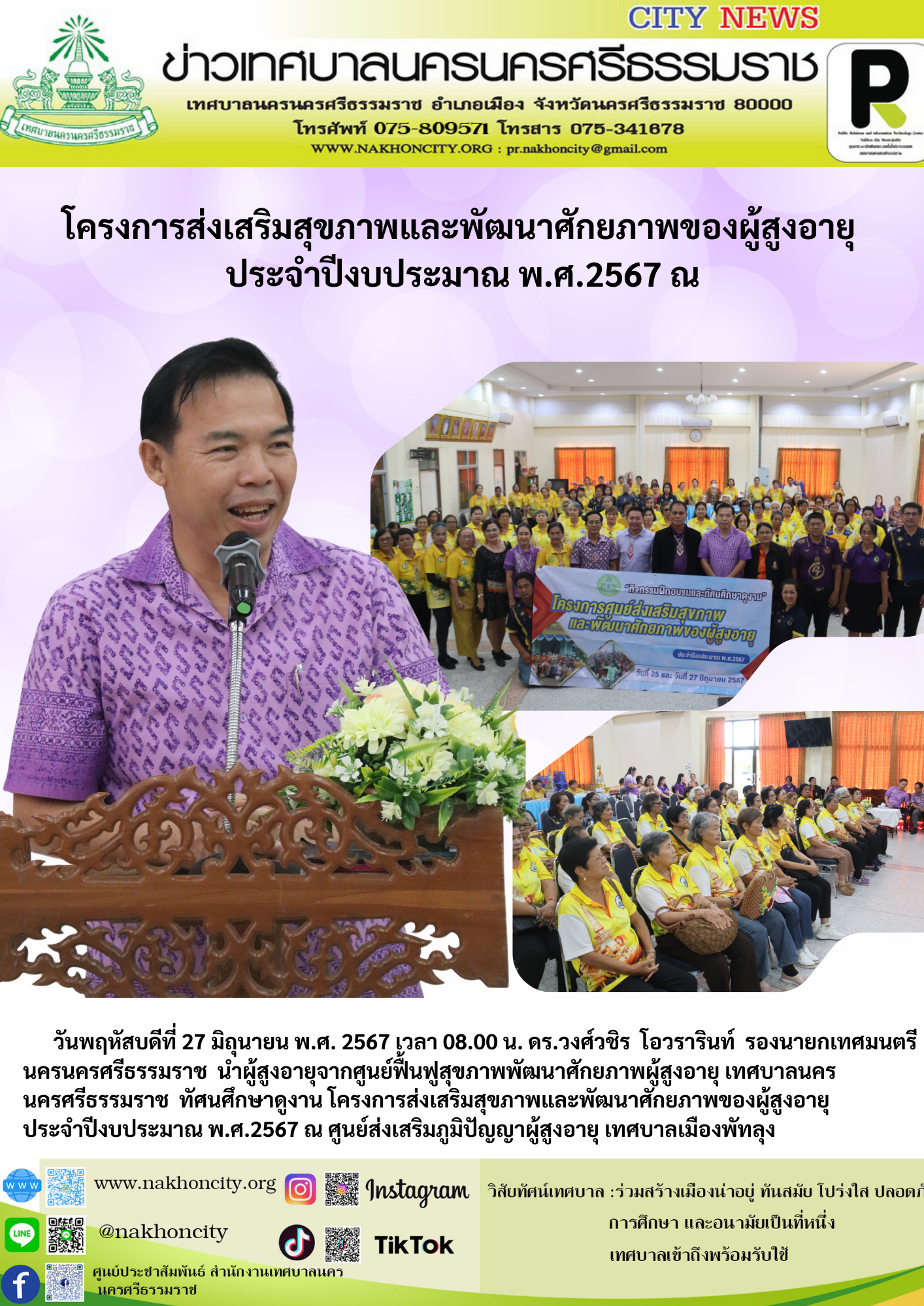 | ดร.วงศ์วชิร โอวรารินท์ รองนายกเทศมนตรีนครนครศรีธรรมราช นำผู้สูงอายุจากศูนย์ฟื้นฟูสุขภาพพัฒนาศักยภาพผู้สูงอายุ เทศบาลนครนครศรีธรรมราช ทัศนศึกษาดูงาน โครงการส่งเสริมสุขภาพและพัฒนาศักยภาพของผู้สูงอายุ ประจำปีงบประมาณ พ.ศ.2567 |