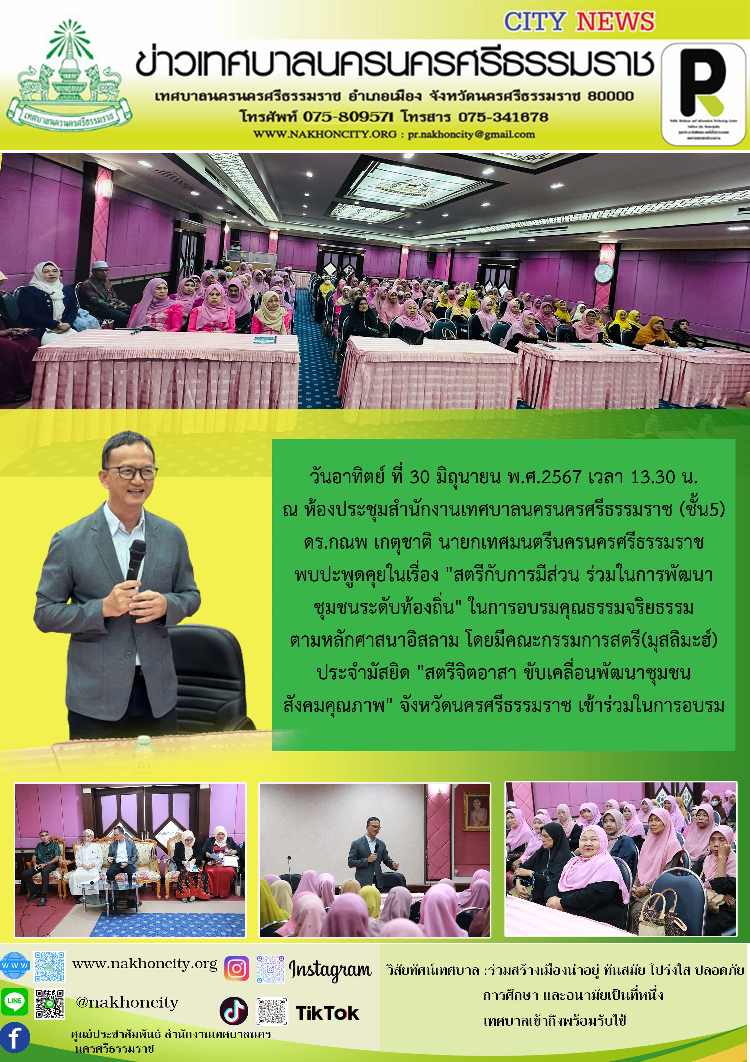 | นายกเทศมนตรีนครนครศรีธรรมราชพบปะพูดคุยในเรื่อง "สตรีกับการมีส่วน ร่วมในการพัฒนาชุมชนระดับท้องถิ่น" ในการอบรมคุณธรรมจริยธรรมตามหลักศาสนาอิสลาม |