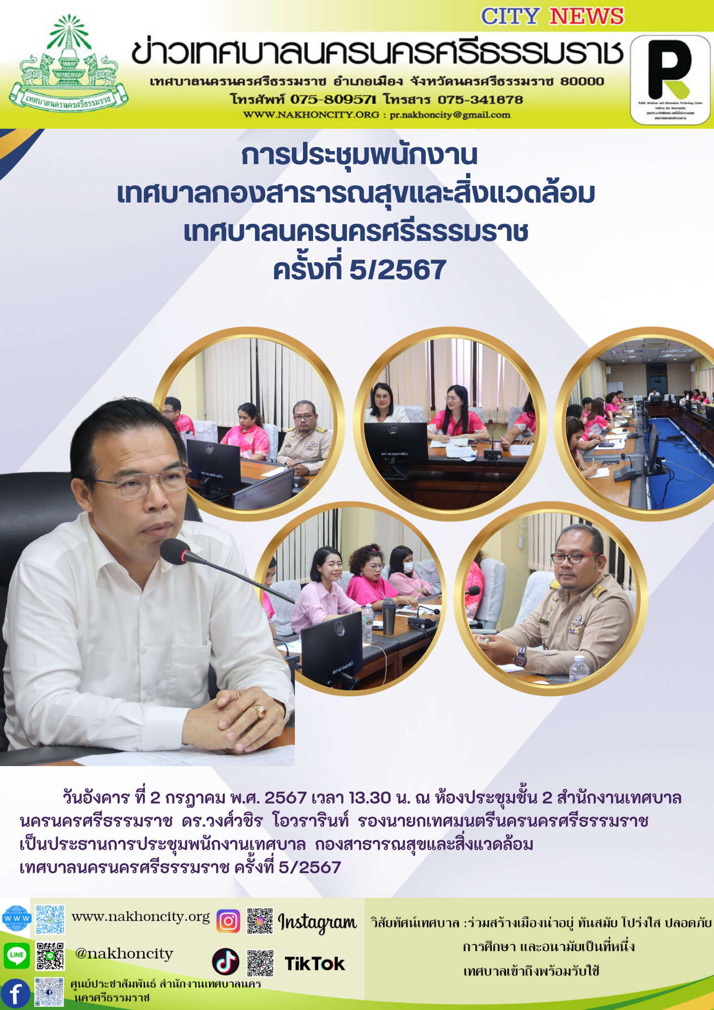 | ดร.วงศ์วชิร โอวรารินท์ รองนายกเทศมนตรีนครนครศรีธรรมราช เป็นประธานการประชุมพนักงานเทศบาล กองสาธารณสุขและสิ่งแวดล้อม เทศบาลนครนครศรีธรรมราช ครั้งที่ 5/2567 |