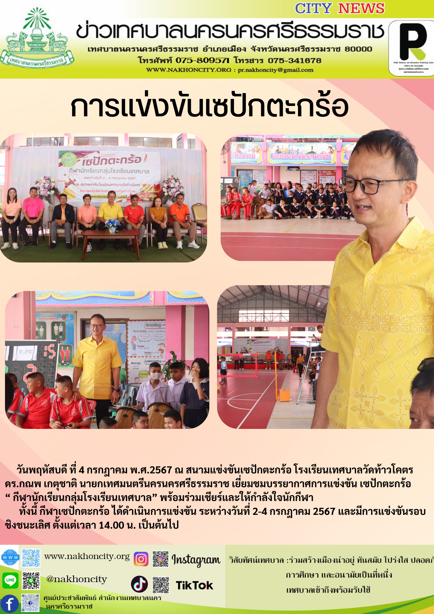 | วันพฤหัสบดี ที่ 4 กรกฎาคม พ.ศ.2567 ณ สนามแข่งขันเซปักตะกร้อ โรงเรียนเทศบาลวัดท้าวโคตร ดร.กณพ เกตุชาติ นายกเทศมนตรีนครนครศรีธรรมราช เยี่ยมชมบรรยากาศการแข่งขัน เซปักตะกร้อ “ กีฬานักเรียนกลุ่มโรงเรียนเทศบาล” พร้อมร่วมเชียร์และให้กำลังใจนักกีฬา ทั้งนี้ กีฬาเซปักตะกร้อ ได้ดำเนินการแข่งขัน ระหว่างวันที่ 2-4 กรกฎาคม 2567 และมีการแข่งขันรอบชิงชนะเลิศ ตั้งแต่เวลา 14.00 น. เป็นต้นไป ขอเชิญผู้สนใจร่วมเชียร์และให้กำลังใจนักกีฬาได้ตาม เวลาที่กำหนด