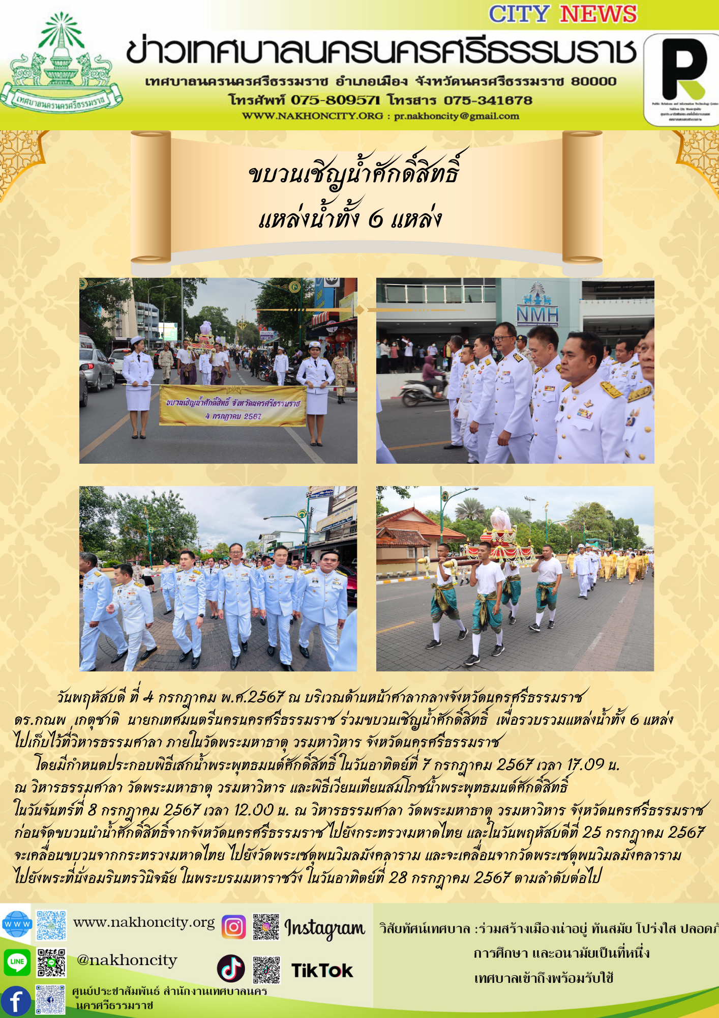 | วันพฤหัสบดี ที่ 4 กรกฎาคม พ.ศ.2567 ณ บริเวณด้านหน้าศาลากลางจังหวัดนครศรีธรรมราช ดร.กณพ เกตุชาติ นายกเทศมนตรีนครนครศรีธรรมราช ร่วมขบวนเชิญน้ำศักดิ์สิทธิ์ เพื่อรวบรวมแหล่งน้ำทั้ง 6 แหล่ง ไปเก็บไว้ที่วิหารธรรมศาลา ภายในวัดพระมหาธาตุ วรมหาวิหาร จังหวัดนครศรีธรรมราช โดยมีกำหนดประกอบพิธีเสกน้ำพระพุทธมนต์ศักดิ์สิทธิ์ ในวันอาทิตย์ที่ 7 กรกฎาคม 2567 เวลา 17.09 น. ณ วิหารธรรมศาลา วัดพระมหาธาตุ วรมหาวิหาร และพิธีเวียนเทียนสมโภชน้ำพระพุทธมนต์ศักดิ์สิทธิ์ ในวันจันทร์ที่ 8 กรกฎาคม 2567 เวลา 12.00 น. ณ วิหารธรรมศาลา วัดพระมหาธาตุ วรมหาวิหาร จังหวัดนครศรีธรรมราช ก่อนจัดขบวนนำน้ำศักดิ์สิทธิ์จากจังหวัดนครศรีธรรมราช ไปยังกระทรวงมหาดไทย และในวันพฤหัสบดีที่ 25 กรกฎาคม 2567 จะเคลื่อนขบวนจากกระทรวงมหาดไทย ไปยังวัดพระเชตุพนวิมลมังคลาราม และจะเคลื่อนจากวัดพระเชตุพนวิมลมังคลาราม ไปยังพระที่นั่งอมรินทรวินิจฉัย ในพระบรมมหาราชวัง ในวันอาทิตย์ที่ 28 กรกฎาคม 2567 ตามลำดับต่อไป |