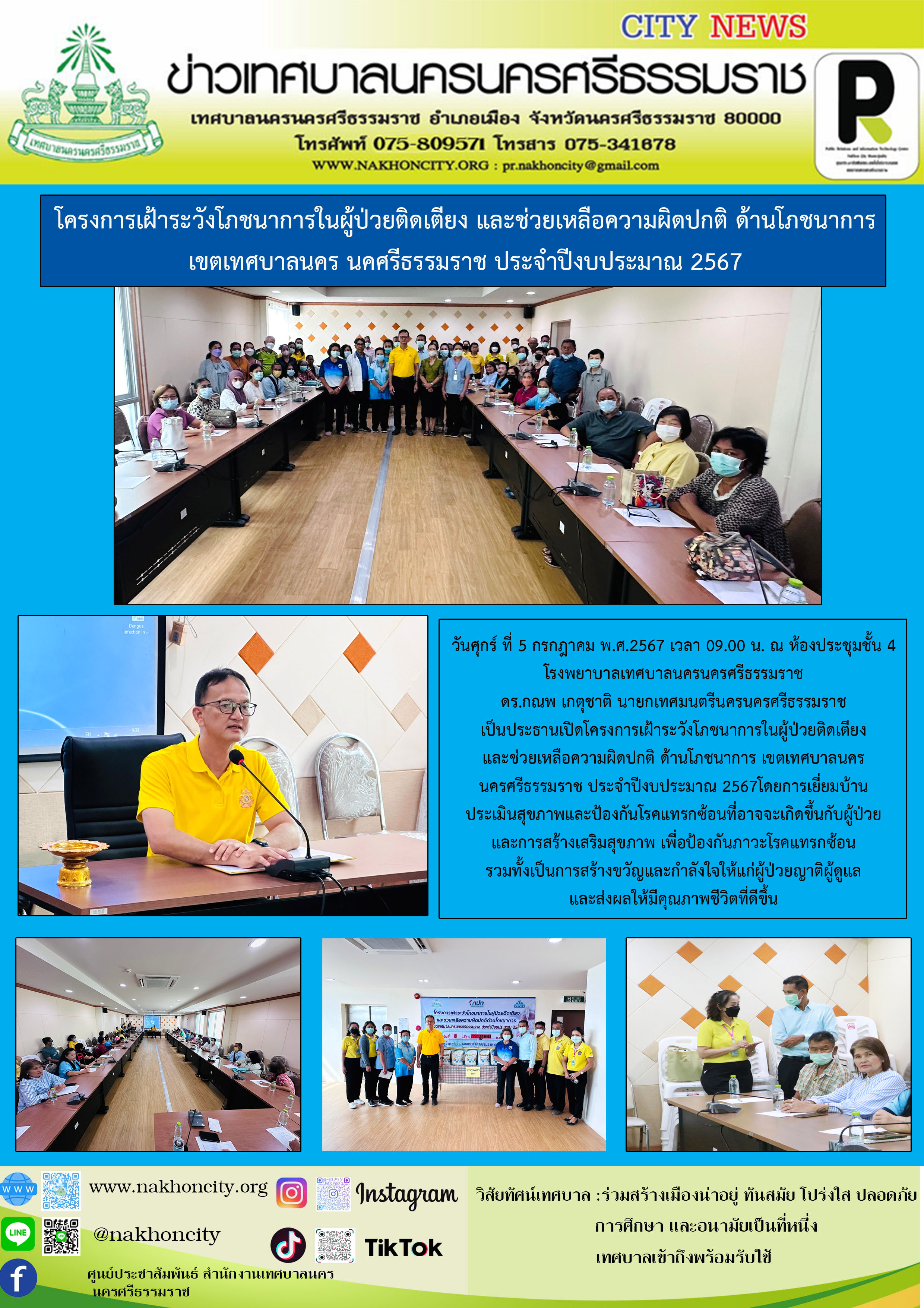 | นายกเทศมนตรีนครนครศรีธรรมราชเป็นประธานเปิดโครงการเฝ้าระวังโภชนาการในผู้ป่วยติดเตียง และช่วยเหลือความผิดปกติ ด้านโภชนาการ เขตเทศบาลนครนคศรีธรรมราช ประจำปีงบประมาณ 2567 |