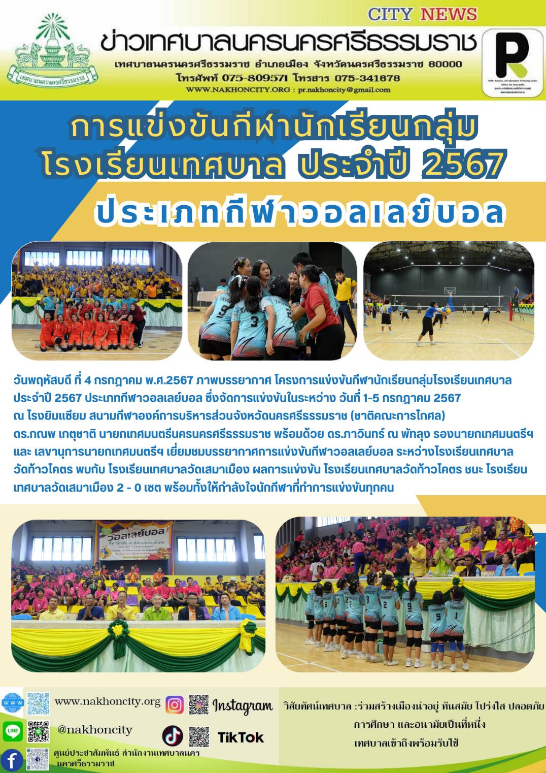 | วันพฤหัสบดี ที่ 4 กรกฎาคม พ.ศ.2567 ภาพบรรยากาศ โครงการแข่งขันกีฬานักเรียนกลุ่มโรงเรียนเทศบาล ประจำปี 2567 ประเภทกีฬาวอลเลย์บอล ซึ่งจัดการแข่งขันในระหว่าง วันที่ 1-5 กรกฎาคม 2567 ณ โรงยิมเเซียม สนามกีฬาองค์การบริหารส่วนจังหวัดนครศรีธรรมราช (ชาติคณะการโกศล) ดร.กณพ เกตุชาติ นายกเทศมนตรีนครนครศรีธรรมราช พร้อมด้วย ดร.ภาวินทร์ ณ พัทลุง รองนายกเทศมนตรีฯ และ เลขานุการนายกเทศมนตรีฯ เยี่ยมชมบรรยากาศการแข่งขันกีฬาวอลเลย์บอล ระหว่างโรงเรียนเทศบาลวัดท้าวโคตร พบกับ โรงเรียนเทศบาลวัดเสมาเมือง ผลการแข่งขัน โรงเรียนเทศบาลวัดท้าวโคตร ชนะ โรงเรียนเทศบาลวัดเสมาเมือง 2 - 0 เซต พร้อมทั้งให้กำลังใจนักกีฬาที่ทำการแข่งขันทุกคน .............. ภาพ//ข่าว//จันทร์จิรา |