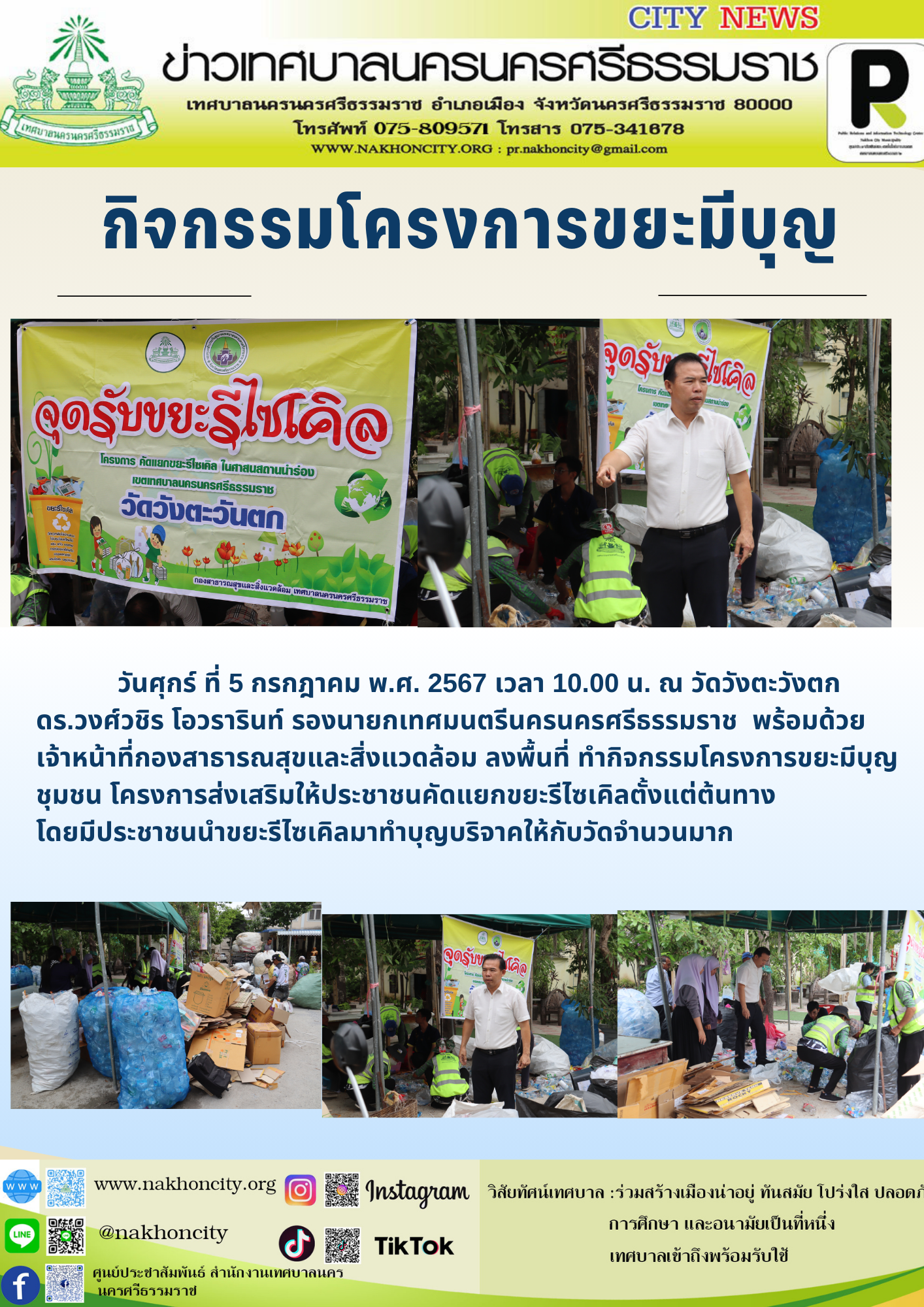 | วันศุกร์ ที่ 5 กรกฎาคม พ.ศ. 2567 เวลา 10.00 น. ดร.วงศ์วชิร โอวรารินท์ รองนายกเทศมนตรีนครนครศรีธรรมราช พร้อมด้วย เจ้าหน้าที่กองสาธารณสุขและสิ่งแวดล้อม ลงพื้นที่ ทำกิจกรรมโครงการขยะมีบุญ ณ วัดวังตะวันตก โครงการส่งเสริมให้ประชาชนคัดแยกขยะรีไซเคิลตั้งแต่ต้นทาง โดยมีประชาชนนำขยะรีไซเคิลมาทำบุญบริจาคให้กับวัดจำนวนมาก |