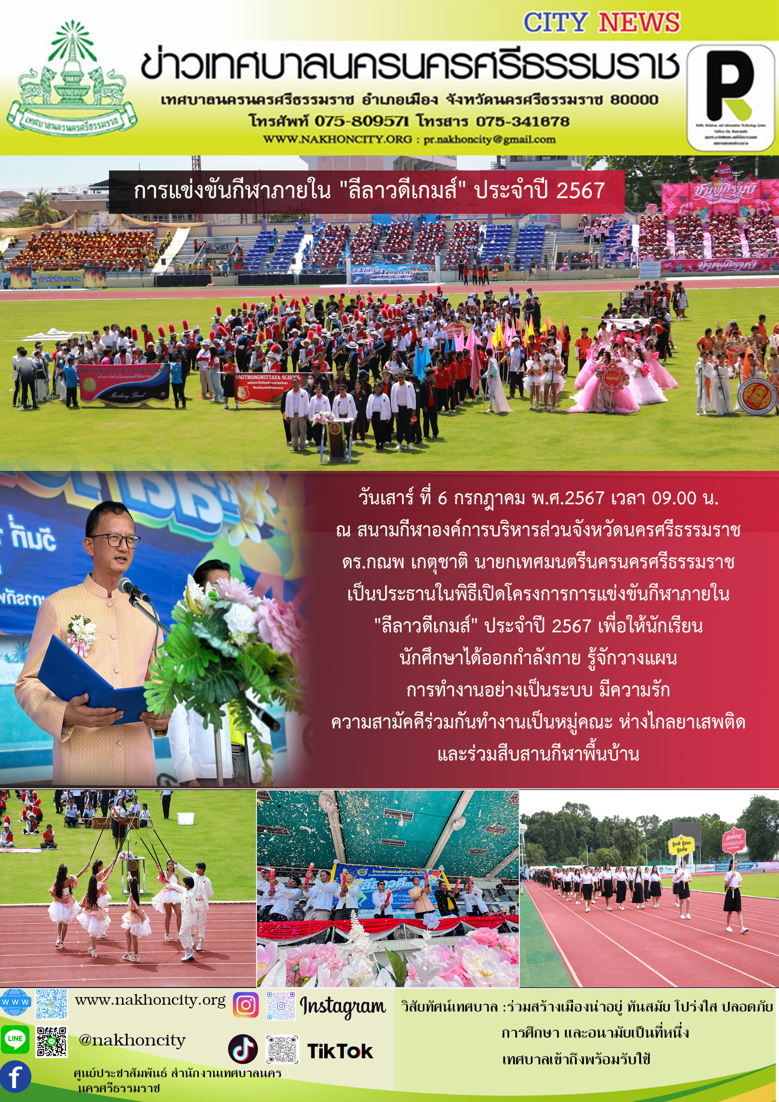 | วันเสาร์ ที่ 6 กรกฎาคม พ.ศ.2567 เวลา 09.00 น. ณ สนามกีฬาองค์การบริหารส่วนจังหวัดนครศรีธรรมราช ดร.กณพ เกตุชาติ นายกเทศมนตรีนครนครศรีธรรมราช เป็นประธานในพิธีเปิดโครงการการแข่งขันกีฬาภายใน "ลีลาวดีเกมส์" ประจำปี 2567 เพื่อให้นักเรียน นักศึกษาได้ออกกำลังกาย รู้จักวางแผนการทำงานอย่างเป็นระบบ มีความรักความสามัคคีร่วมกันทำงานเป็นหมู่คณะ ห่างไกลยาเสพติด และร่วมสืบสานกีฬาพื้นบ้าน