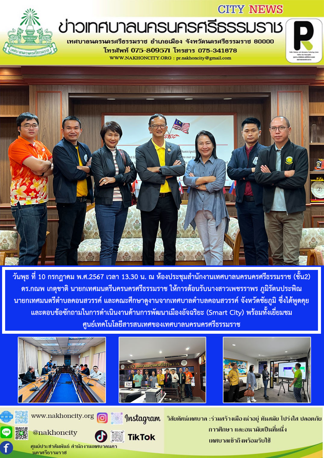 | นายกเทศมนตรีนครนครศรีธรรมราช ให้การต้อนรับนางสาวเพชรราพร ภูมิรัตนประพิณ นายกเทศมนตรีตำบลคอนสวรรค์ และคณะศึกษาดูงานจากเทศบาลตำบลคอนสวรรค์ จังหวัดชัยภูมิ ซึ่งได้พูดคุยและตอบข้อซักถามในการดำเนินงานด้านการพัฒนาเมืองอัจฉริยะ (Smart City) |