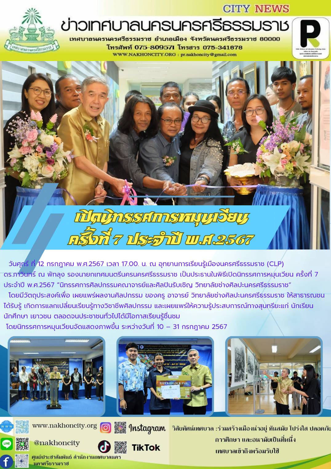 | ดร.ภาวินทร์ ณ พัทลุง รองนายกเทศมนตรีนครนครศรีธรรมราช เป็นประธานในพิธีเปิดนิทรรศการหมุนเวียน ครั้งที่ 7 ประจำปี พ.ศ.2567 “นิทรรศการศิลปกรรมคณาจารย์และศิลปินรับเชิญ วิทยาลัยช่างศิลปะนครศรีธรรมราช” |