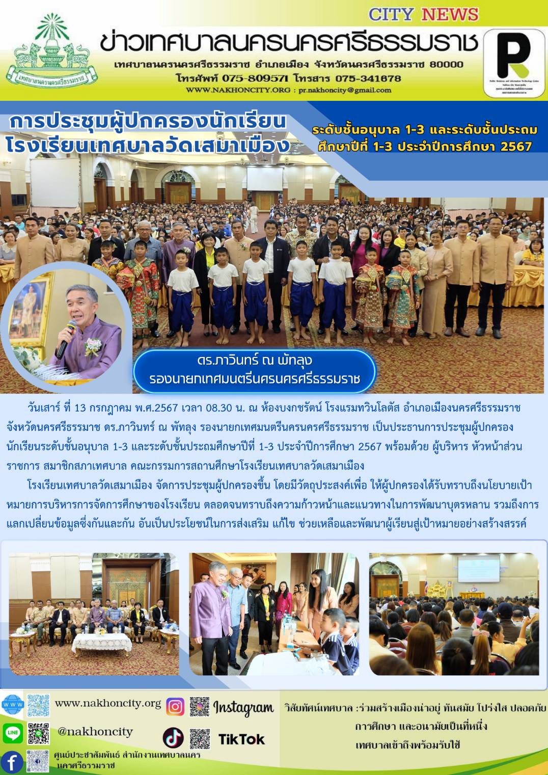| ดร.ภาวินทร์ ณ พัทลุง รองนายกเทศมนตรีนครนครศรีธรรมราช เป็นประธานการประชุมผู้ปกครอง โรงเรียนเทศบาลวัดเสมาเมือง นักเรียนระดับชั้นอนุบาล 1-3 และระดับชั้นประถมศึกษาปีที่ 1-3 ประจำปีการศึกษา 2567 |