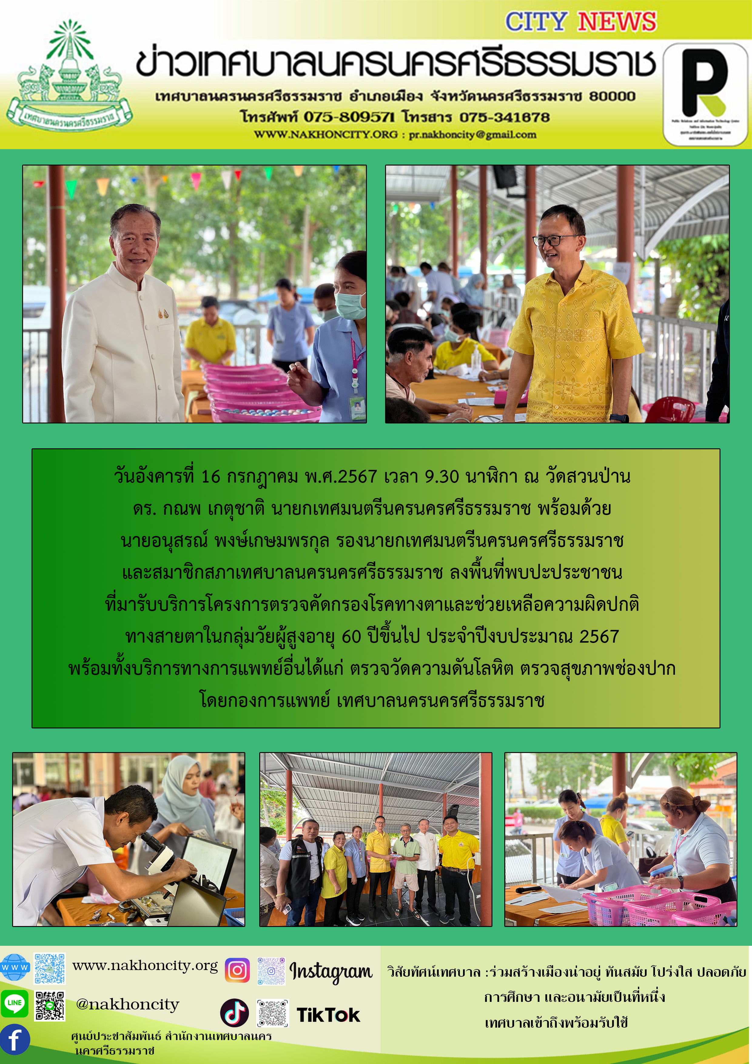 | วันอังคารที่ 16 กรกฎาคม พ.ศ.2567 เวลา 9.30 นาฬิกา ณ วัดสวนป่าน ดร. กณพ เกตุชาติ นายกเทศมนตรีนครนครศรีธรรมราช พร้อมด้วยนายอนุสรณ์ พงษ์เกษมพรกุล รองนายกเทศมนตรีนครนครศรีธรรมราชและสมาชิกสภาเทศบาลนครนครศรีธรรมราช ลงพื้นที่พบปะประชาชนที่มารับบริการโครงการตรวจคัดกรองโรคทางตาและช่วยเหลือความผิดปกติทางสายตาในกลุ่มวัยผู้สูงอายุ 60 ปีขึ้นไป ประจำปีงบประมาณ 2567 พร้อมทั้งบริการทางการแพทย์อื่นได้แก่ ตรวจวัดความดันโลหิต ตรวจสุขภาพช่องปาก โดยกองการแพทย์ เทศบาลนครนครศรีธรรมราช |