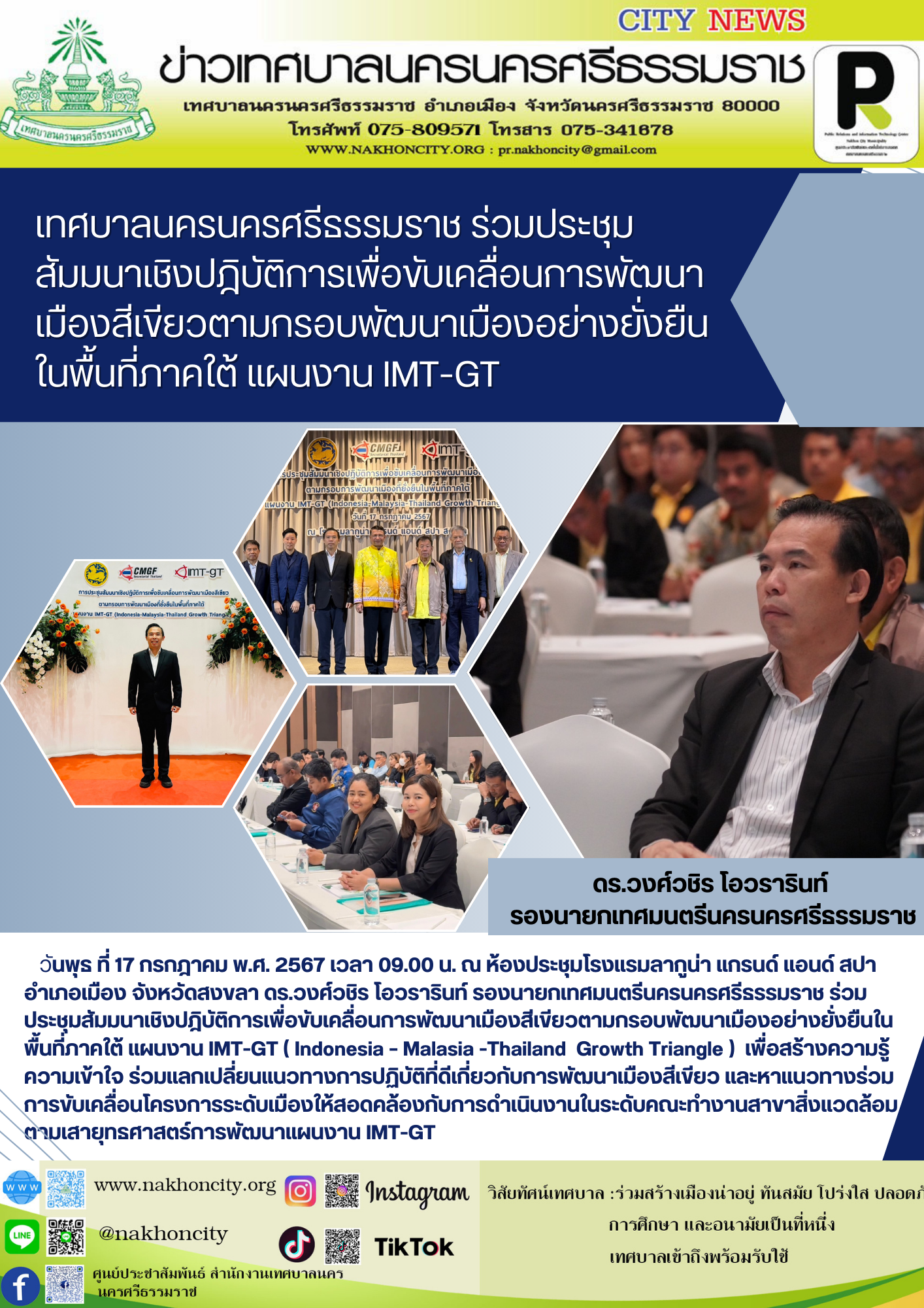 | ดร.วงศ์วชิร โอวรารินท์ รองนายกเทศมนตรีนครนครศรีธรรมราช ร่วมประชุมสัมมนาเชิงปฎิบัติการเพื่อขับเคลื่อนการพัฒนาเมืองสีเขียวตามกรอบพัฒนาเมืองอย่างยั่งยืนในพื้นที่ภาคใต้ แผนงาน IMT-GT |